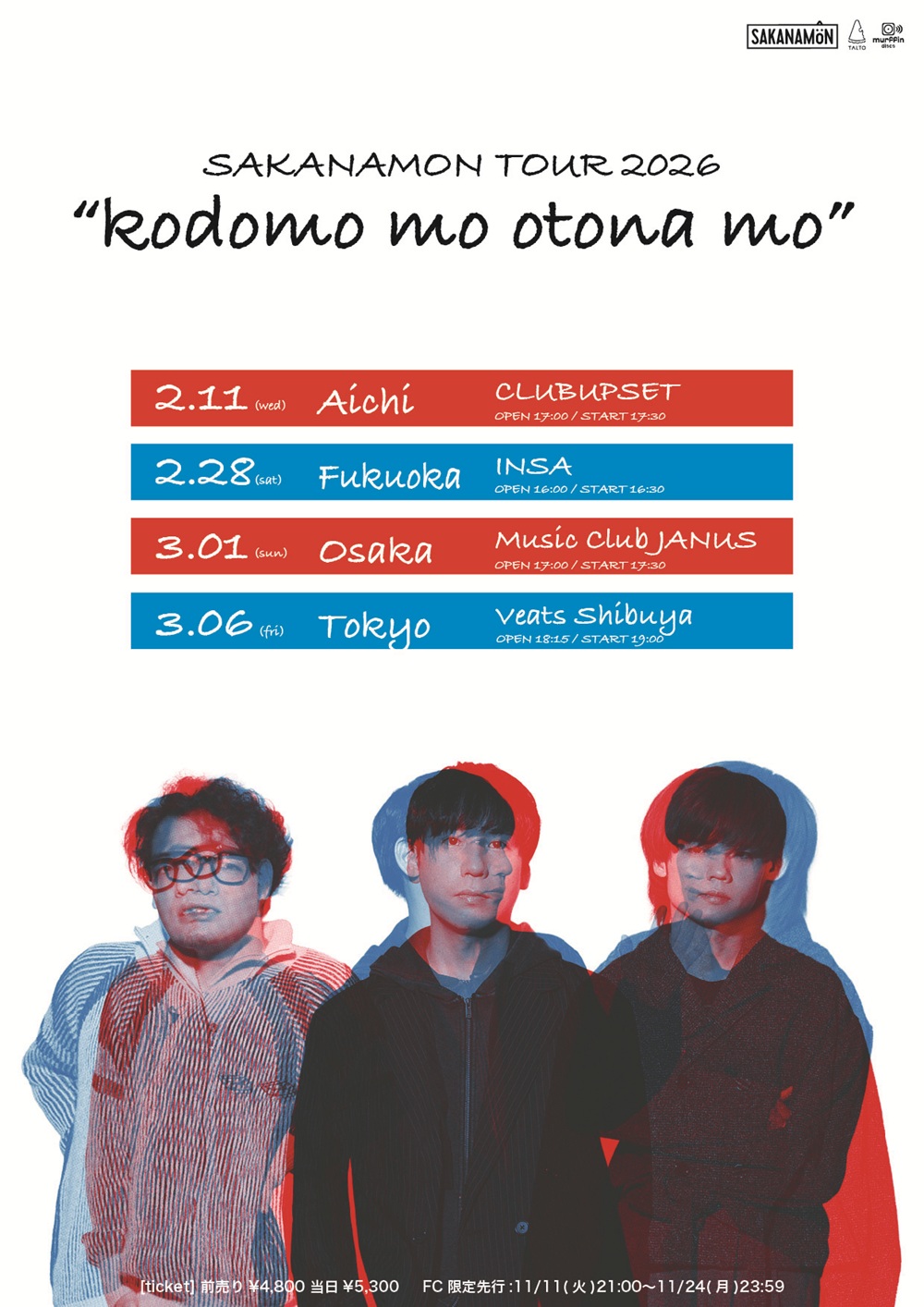 Bass: 森野光晴(モリノ ミツハル) 1988.3.8 東京都出身 Vocal/Guitar: 藤森元生(フジモリ ゲンキ) 1988.3.6 宮崎県出身 Drums: 木村浩大(キムラ コウタ)1988.3.17 青森県出身 上京と同時に組んでいたバンドが解散し、一人で曲作りを続けていた藤森が、 2007年12月 専門学校の同級生である森野と出会い結成。 「聴く人の生活の"肴"になるような音楽を作りたい」という願いからSAKANAMONと命名する。 2009年4月より木村が加入。 2010年5月には初の自主企画ライブ「SAKANAMON THE WORLD」を開催。 同年冬にはタワーレコード主催のオーディションで1000組以上の中から選ばれ、期間限定のCDが全国発売され注目を集め始める。 同年9月に待望の1stミニアルバム「浮遊ギミック」をBUDDY RECORDSより全国リリース。 タワーレコードプッシュアイテム【タワレコメン】に選出され現在もロングヒット中。 2012年、ビクターの「GettingBetter」よりメジャーデビューが決定! 12月メジャー1st album「na」をリリース! 2015年4月に3rd Album「あくたもくた」リリース。ワンマンツアーのツアーファイナルはZEPP DIVERCITYで行い、過去最大規模の会場で成功におさめる。 2015年12月9日タワーレコード限定シングル「PLAYER PRAYER」をリリース。奇妙なイカのジャケットが話題を呼び、売り切れでCDが店頭に並ばない状況に。 2016年4月20日待望の4th Album「HOT ATE」のリリースが決定! ”サカなもん”というマスコットキャラクターを従え、独特のライブパフォーマンスを展開している。