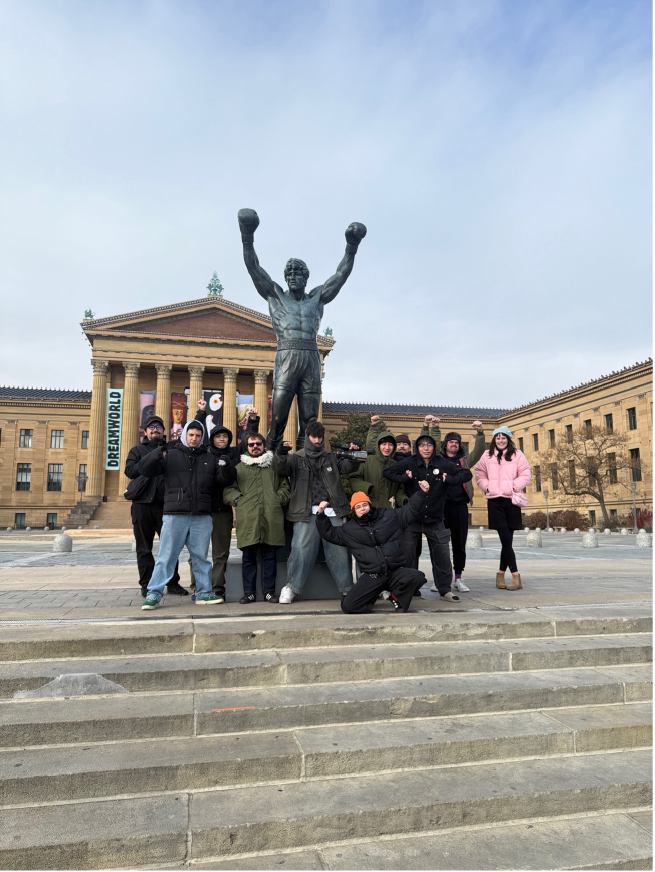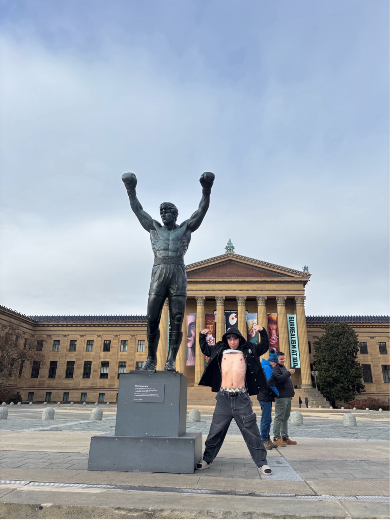 宿泊していたBaltimoreからPhilly間は車で2時間ちょっととそんなに離れておらず、だいぶ早めの到着。会場入りまで時間があるので皆んなで映画『ロッキー』の名シーンの舞台、ロッキーストリートに行く事に。あれってフィリーだったんだ。初知り。近くに車を停め公園を歩き、皆んなで映画のシーンと同じく階段を駆け上がる。なんて良い光景なのだろうか。階段を上がった先にあるロッキー像と記念写真を撮った。