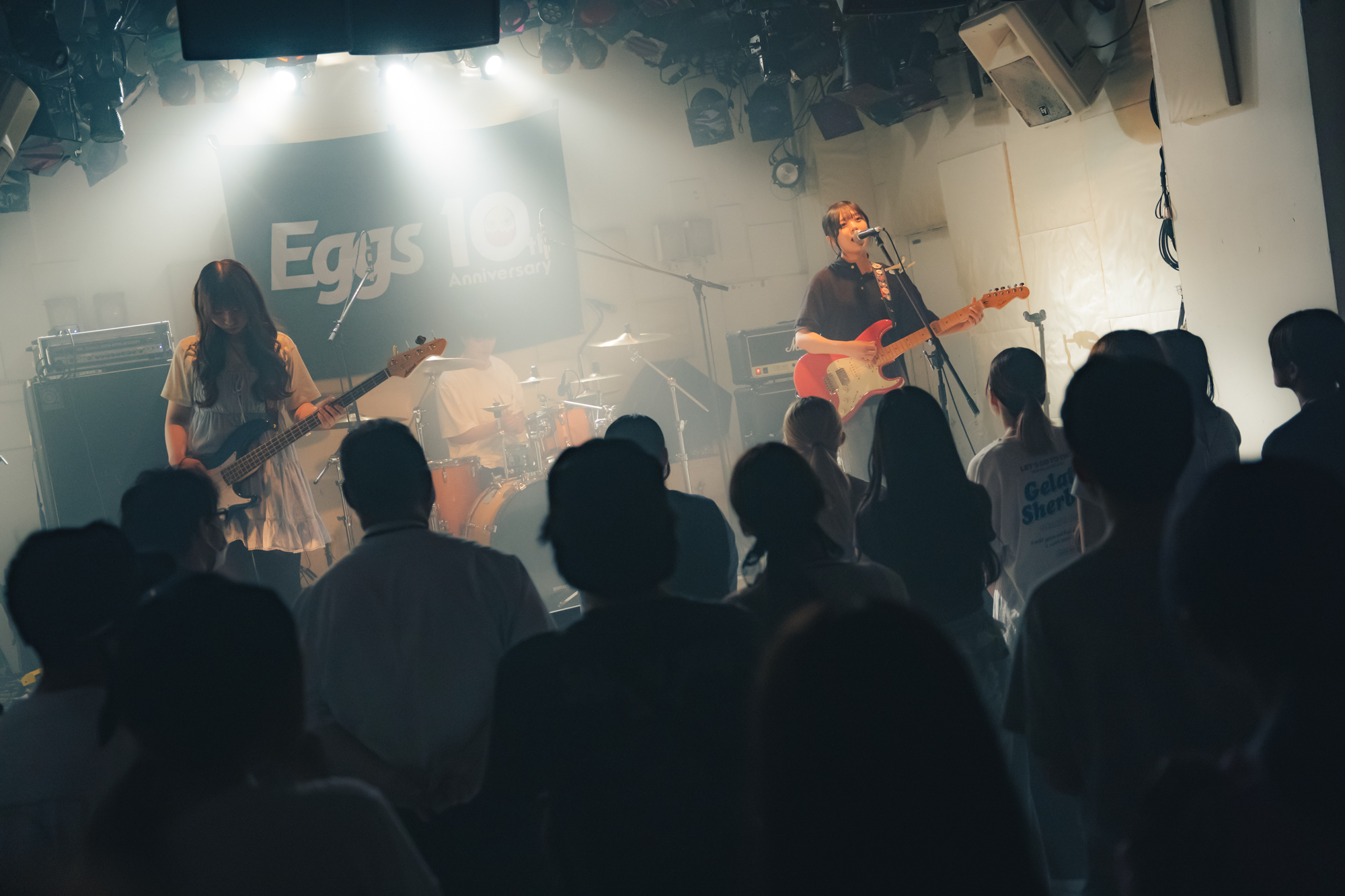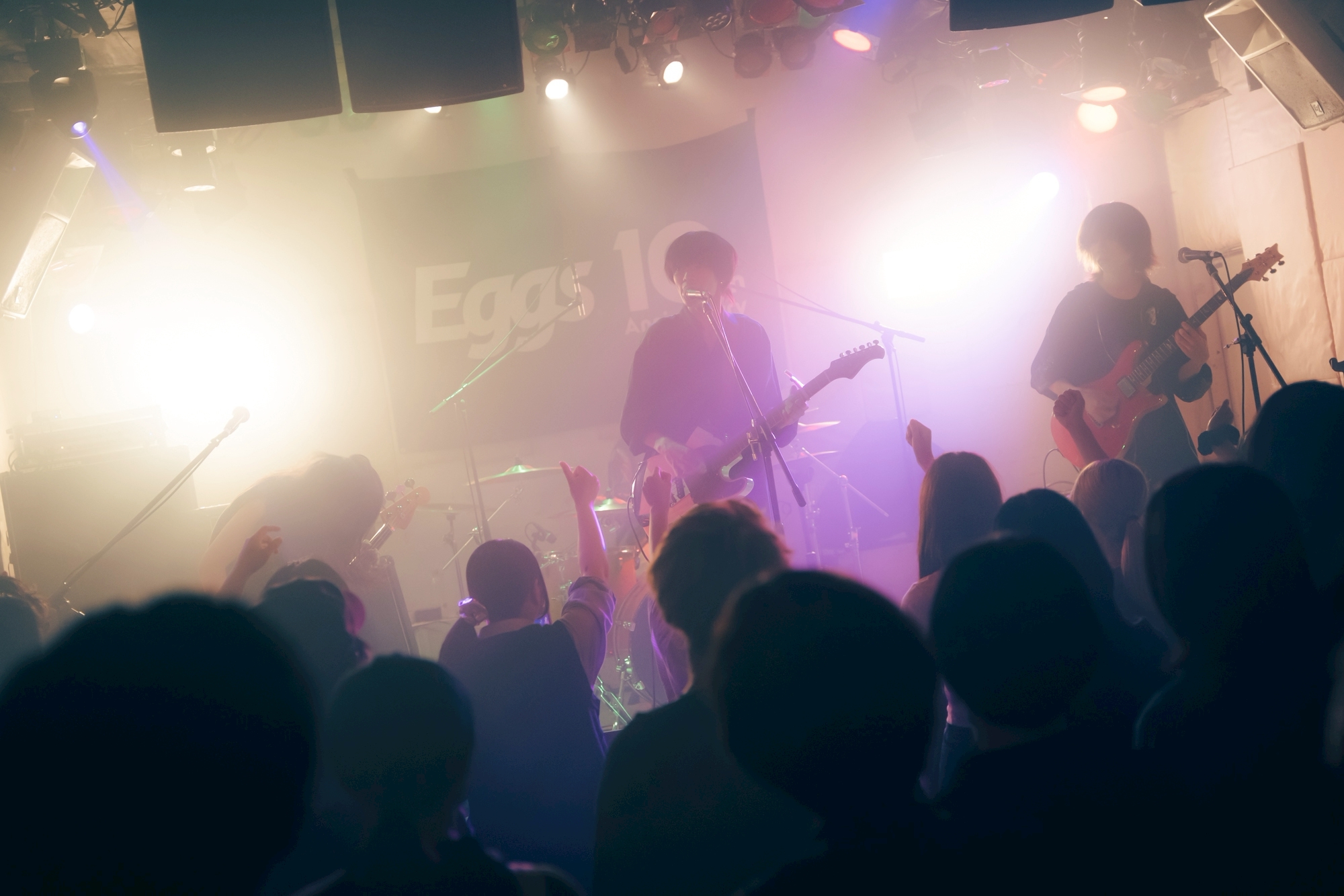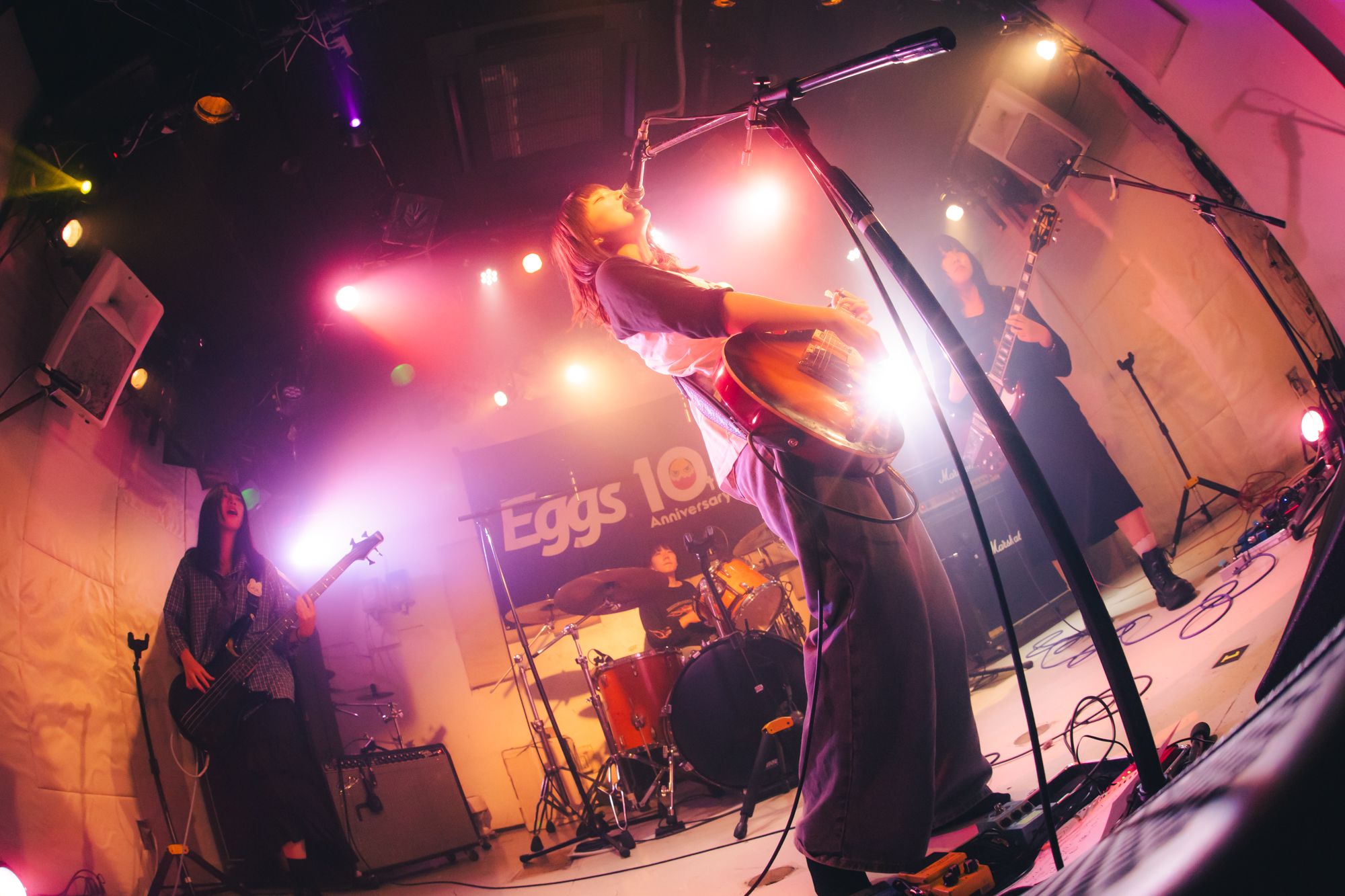 1組目は東京を拠点に活動する高校3年生4ピースガールズバンド、乙女座症候群だ。アッパーな「天使の歩幅」「春ぐもり」で勢いよくスタートすると、ハンズアップするオーディエンスは次第にテンションを高めていく。「Eggsさんの10周年、おめでとうございます。いわば誕生パーティーってことですよ!」と元気に祝いの言葉を述べたゆな(Vo./Gt.)は、自身が10歳の頃は二分の一成人式をやったと振り返る。そして「Eggsさんは“10歳”でビッグな存在になった」と感服。そうは言いつつも、ゆな(Gt.)のエネルギッシュで伸びやかな歌声と、くみのタッピングを交えた艶やかなギターサウンド、りなべる(Ba.)のスラップやスライド奏法を駆使した滑らかなベースラインに加え、ナナミ(Dr.)の揺るぎないリズムを刻むパワフルなドラミング。高校生とは思えぬテクニックを魅せる乙女座症候群に、見ているこちらが感服してしまう。ラストまで集中力を持続させたままフロアを盛り上げ、見事トッパーの役目を果たした。
