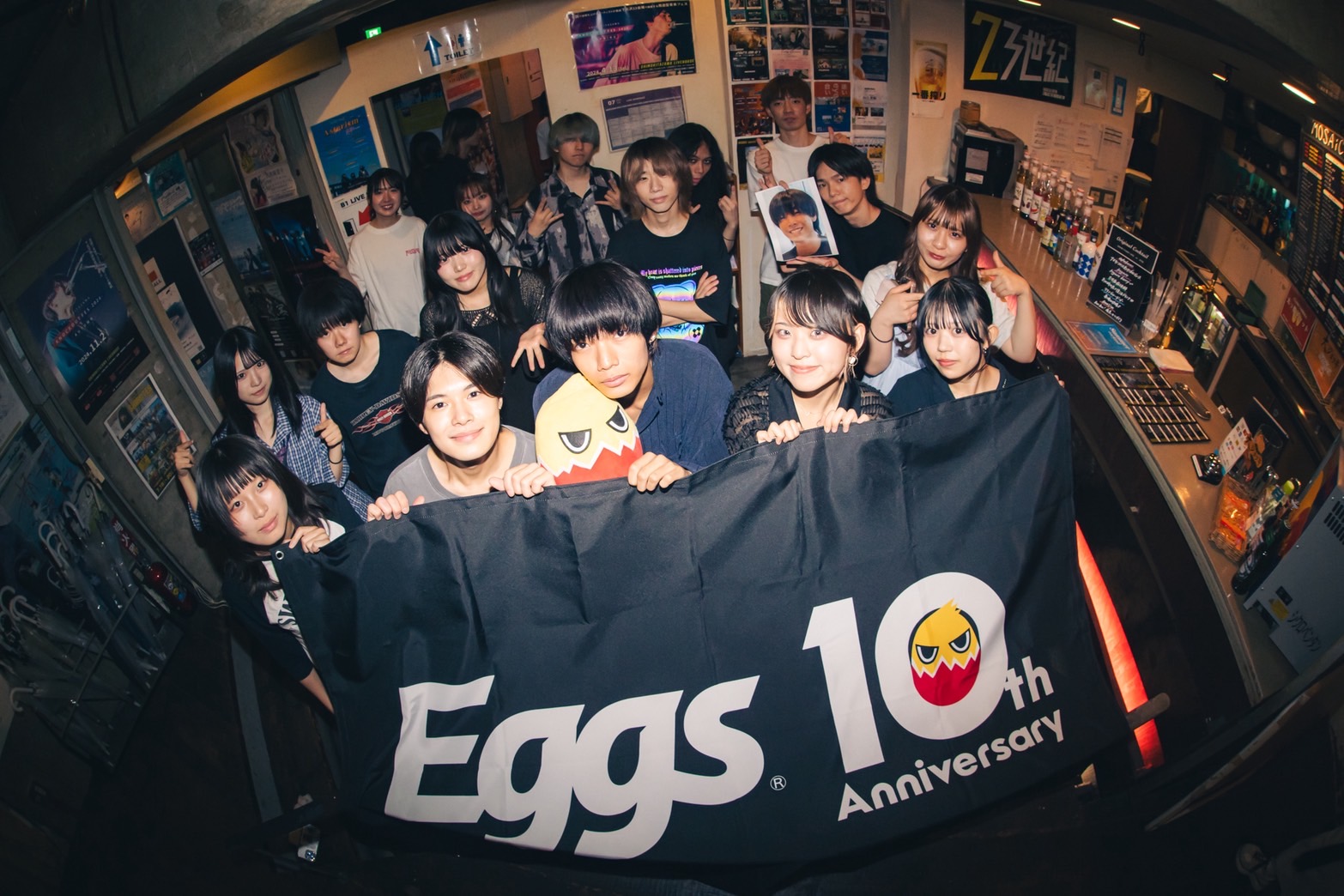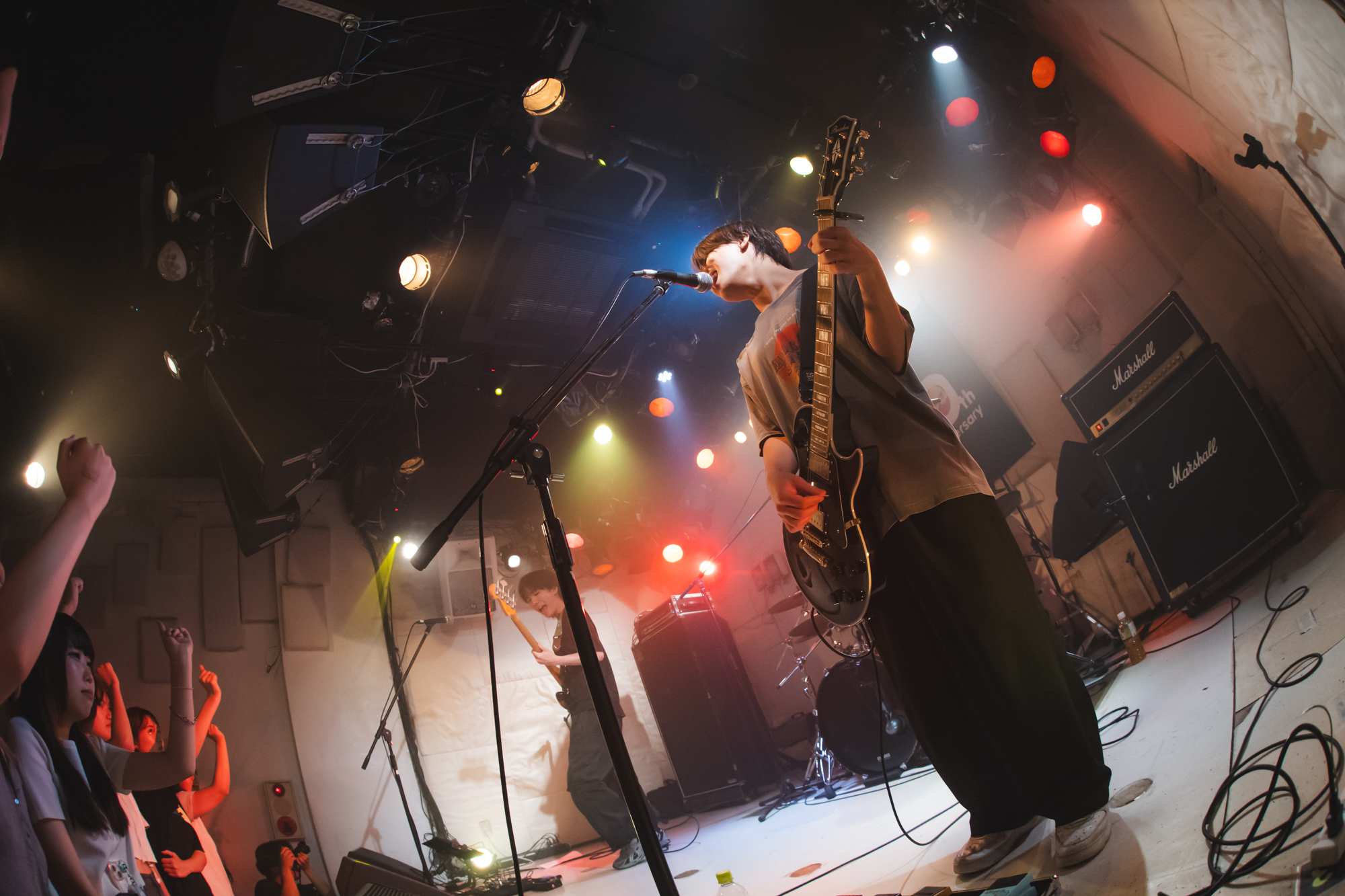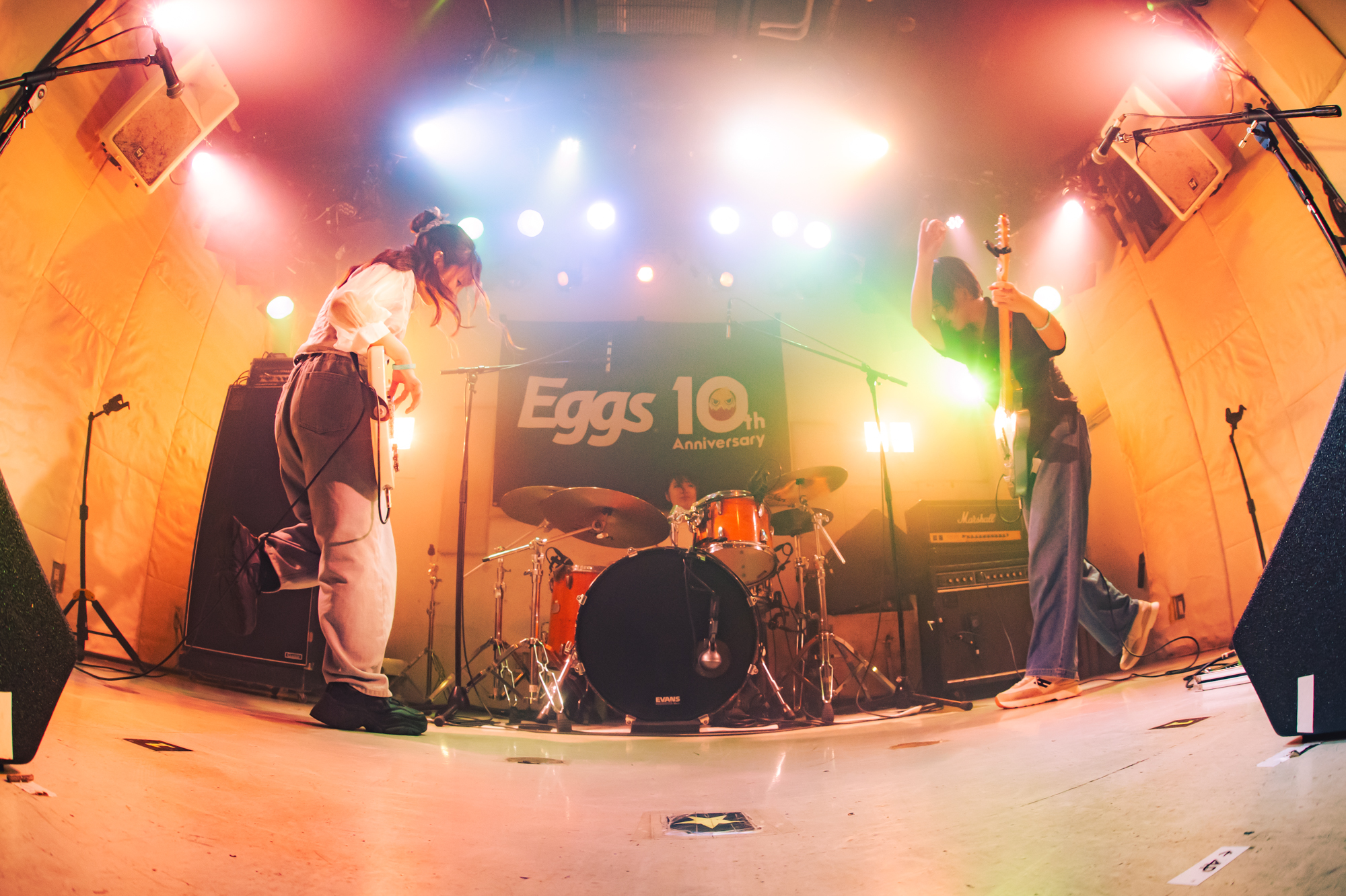1組目は東京を拠点に活動する高校3年生4ピースガールズバンド、乙女座症候群だ。アッパーな「天使の歩幅」「春ぐもり」で勢いよくスタートすると、ハンズアップするオーディエンスは次第にテンションを高めていく。「Eggsさんの10周年、おめでとうございます。いわば誕生パーティーってことですよ!」と元気に祝いの言葉を述べたゆな(Vo./Gt.)は、自身が10歳の頃は二分の一成人式をやったと振り返る。そして「Eggsさんは“10歳”でビッグな存在になった」と感服。そうは言いつつも、ゆな(Gt.)のエネルギッシュで伸びやかな歌声と、くみのタッピングを交えた艶やかなギターサウンド、りなべる(Ba.)のスラップやスライド奏法を駆使した滑らかなベースラインに加え、ナナミ(Dr.)の揺るぎないリズムを刻むパワフルなドラミング。高校生とは思えぬテクニックを魅せる乙女座症候群に、見ているこちらが感服してしまう。ラストまで集中力を持続させたままフロアを盛り上げ、見事トッパーの役目を果たした。