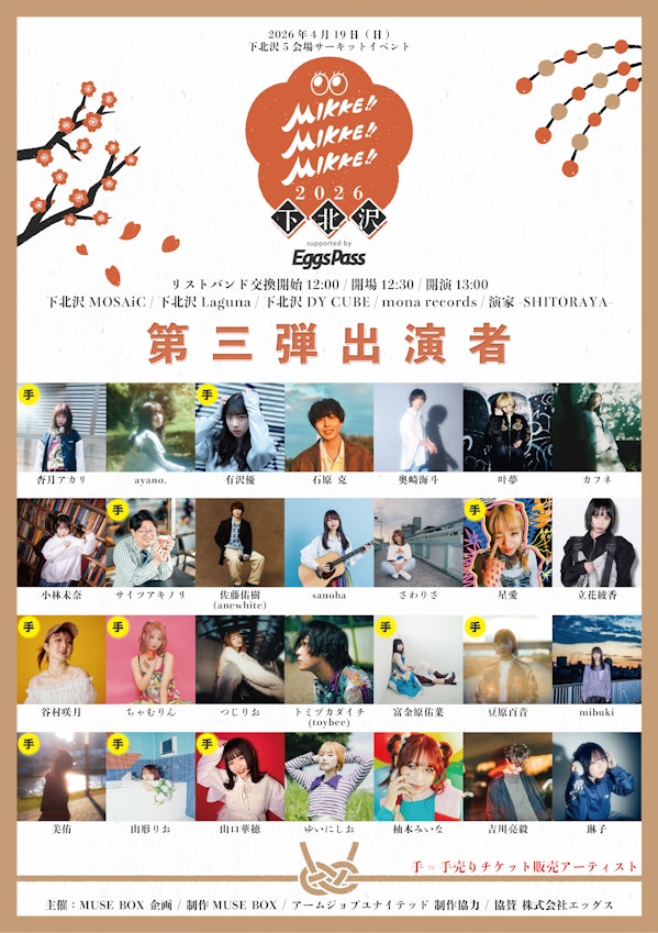 4月19日に下北沢のライブハウスを会場に開催されるシンガーソングライター限定のサーキットライブMIKKE!! MIKKE!! MIKKE!! 2026 下北沢 supported by Eggs Pass。