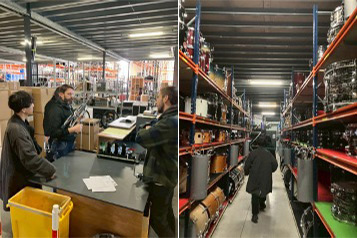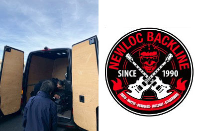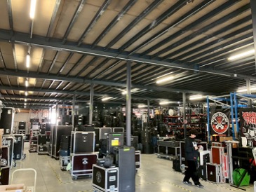『NEWLOC BACKLINE』社に到着。巨大な機材庫には、所狭しと楽器が並び圧巻。多くのバンドがここでツアー用の機材をレンタルしている。