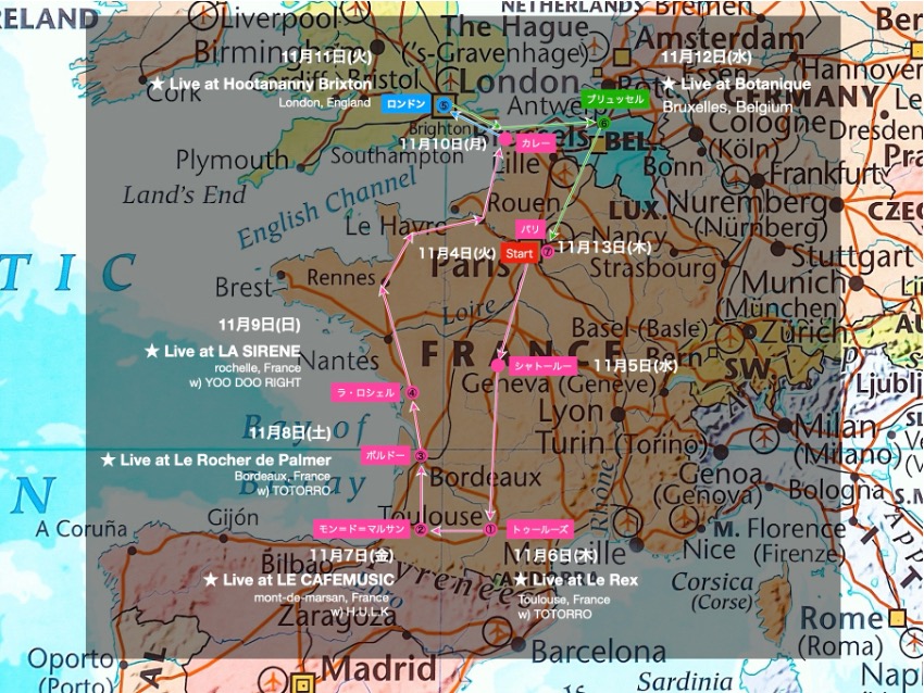 11月4日(火)パリ・フランス、シャルル・ド・ゴール空港(CDG)からスタートし、フランス4ヶ所、2回の休憩日を挟みつつ、ロンドンとブリュッセルを経て11月13日(木)最終日のパリ公演まで走り切る。