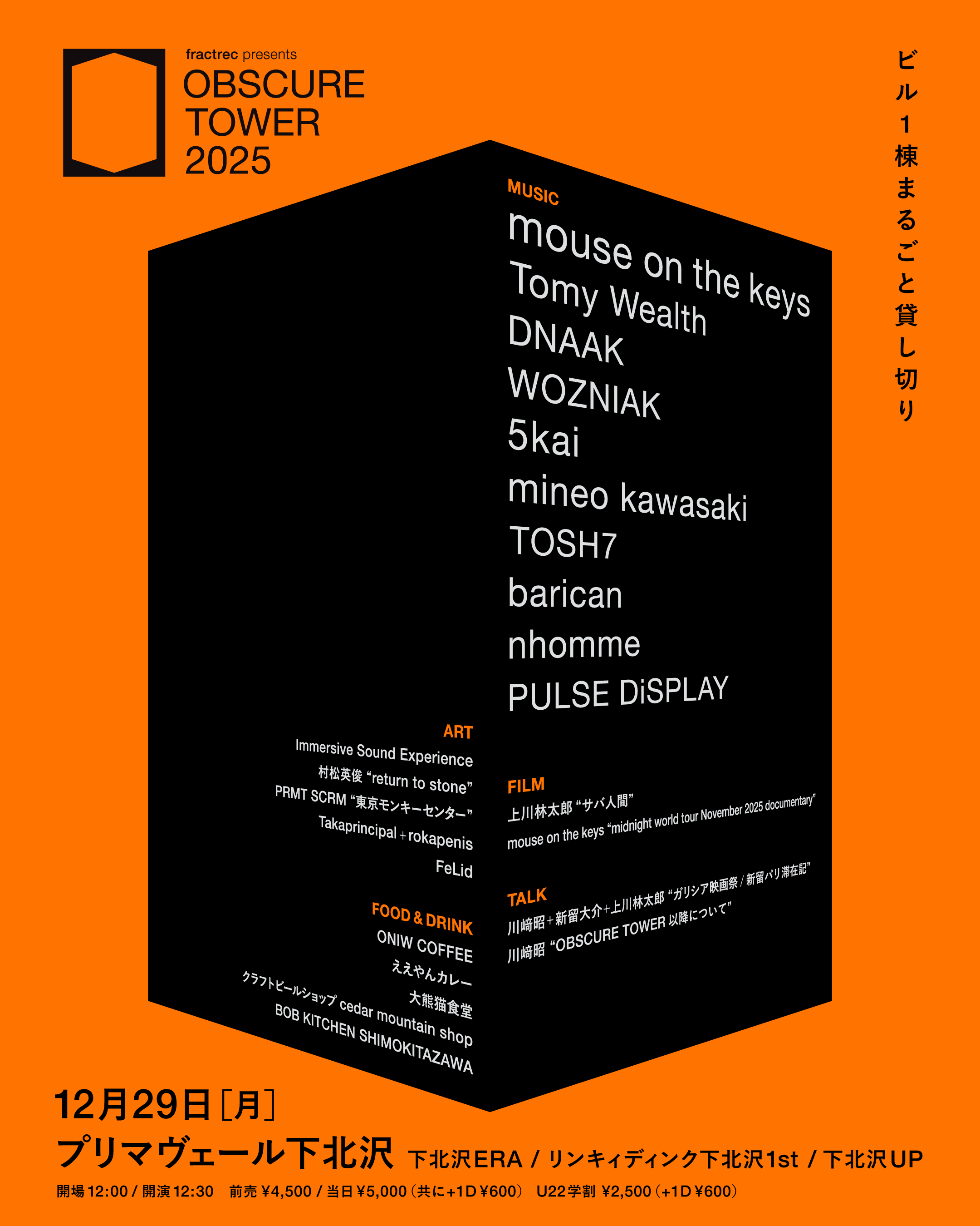 川﨑:まず、mouse on the keysが2026年に20周年を迎える、そのプレイベントをやろうって提案したんです。普段からお世話になっている下北沢ERAに普段対バンしてそうでしていないバンドを集めて。先ほどの話にも出たSST RECORDSのバンドのように、雑食性があったり、細かくてわからないグレーゾーンというか、まさにオブスキュアなバンドを集めてイベントをやろうって話になったんですね。で、話していくうちに下北沢ERAが入ってるプリマヴェール下北沢ビル、もう一棟全部貸し切ってトークとか上映もやっちゃおうってことになり。