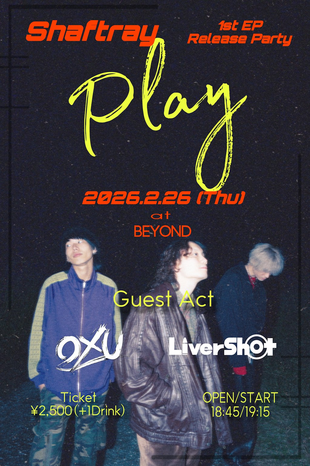 大阪北摂発ロックバンド Shaftrayの嶋大翔です!この度初となるEPのリリースが決定し、2度目となる自主企画「Play」を開催することになりました。PlayとはEPの表題曲「Inside Game」をイメージして名付けたタイトルになります。是非この日は、アメリカ村BEYONDで踊って、踊って、楽しんで帰って欲しいです!!!