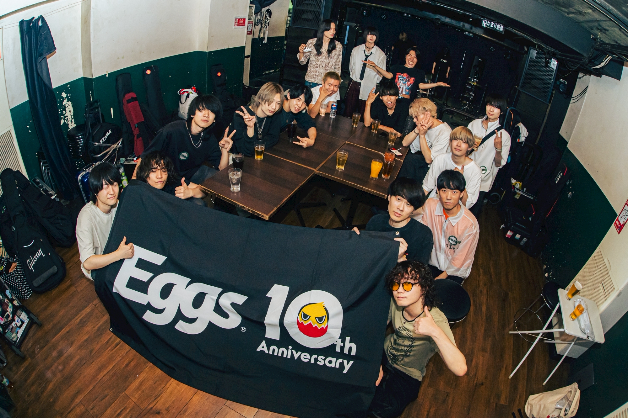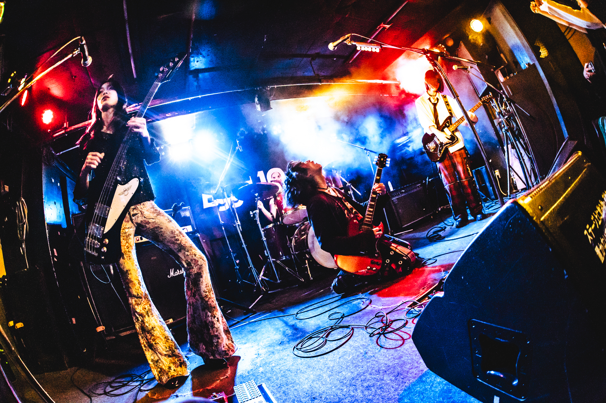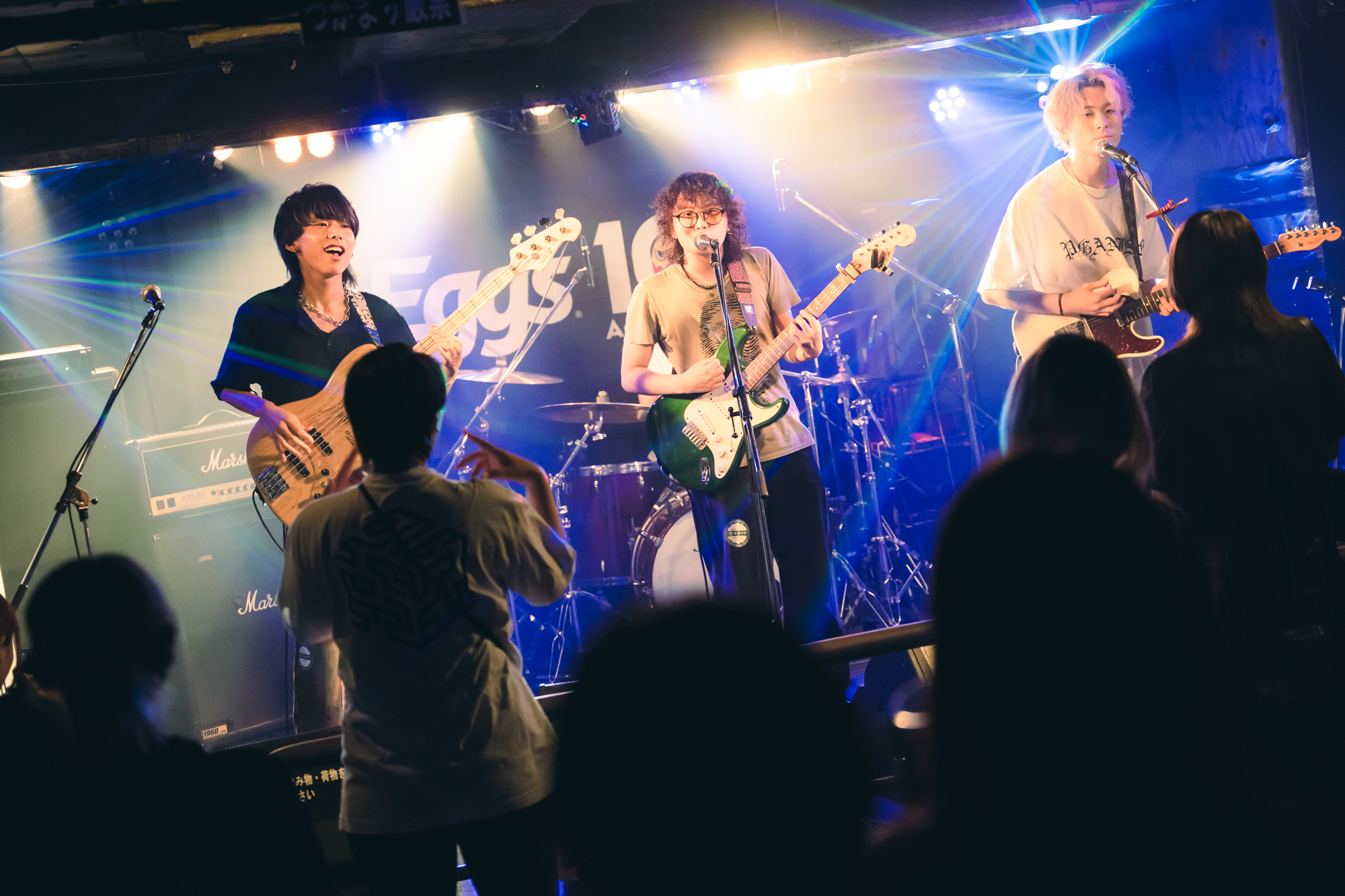 トリを飾るのは2022年6月に結成された4ピースロックバンド、Jankie Machine。『Tokyo Music Rise 2023』など、若手バンドのコンテストで多々受賞歴のある実力派バンドだ。ステージに登場した4人は、グランジロック風、ゴシックパンク風、ロックプリンス風、上半身裸という奇天烈な出で立ちで、強烈な個性を放つ。1曲目は奇声混じりのファルセットで歌い出す「バラ色の人生」。滑らかに流れるギターリフが耳に残る。「おはようございますの人はおはようございます。こんにちはの人はこんにちは。おはこんばんちは。Jankie Machineです、フゥ〜」とナカムラヒカル(Vo./Gt.)がトリッキーなご挨拶を。生配信中だからと下ネタを連発するも、絶妙にユニークなトークに昇華させ、オーディエンスの笑いを誘う。「これはフィクションじゃない!」は、重厚にうねるベースラインとアグレッシブなドラミングの混ざり合い、フロアの熱気をさらに引き上げる。ラストは、ナカムラの心の叫びを歌うロックチューン「ナカムラヒカルハヒカラナイ」を披露した。メンバーが退場すると、フロアからアンコールの手拍子が。再び登場したナカムラは、予定になかったアンコールをEggsスタッフにお願いし、見事快諾。「何をやろう?」とセレクトしたのは、2023年2月にEggsでリリースした「からげんき」だ。Eggsに縁のある粋な選曲とエキセントリックなパフォーマンスでオーディエンスを熱気に包んだ。
