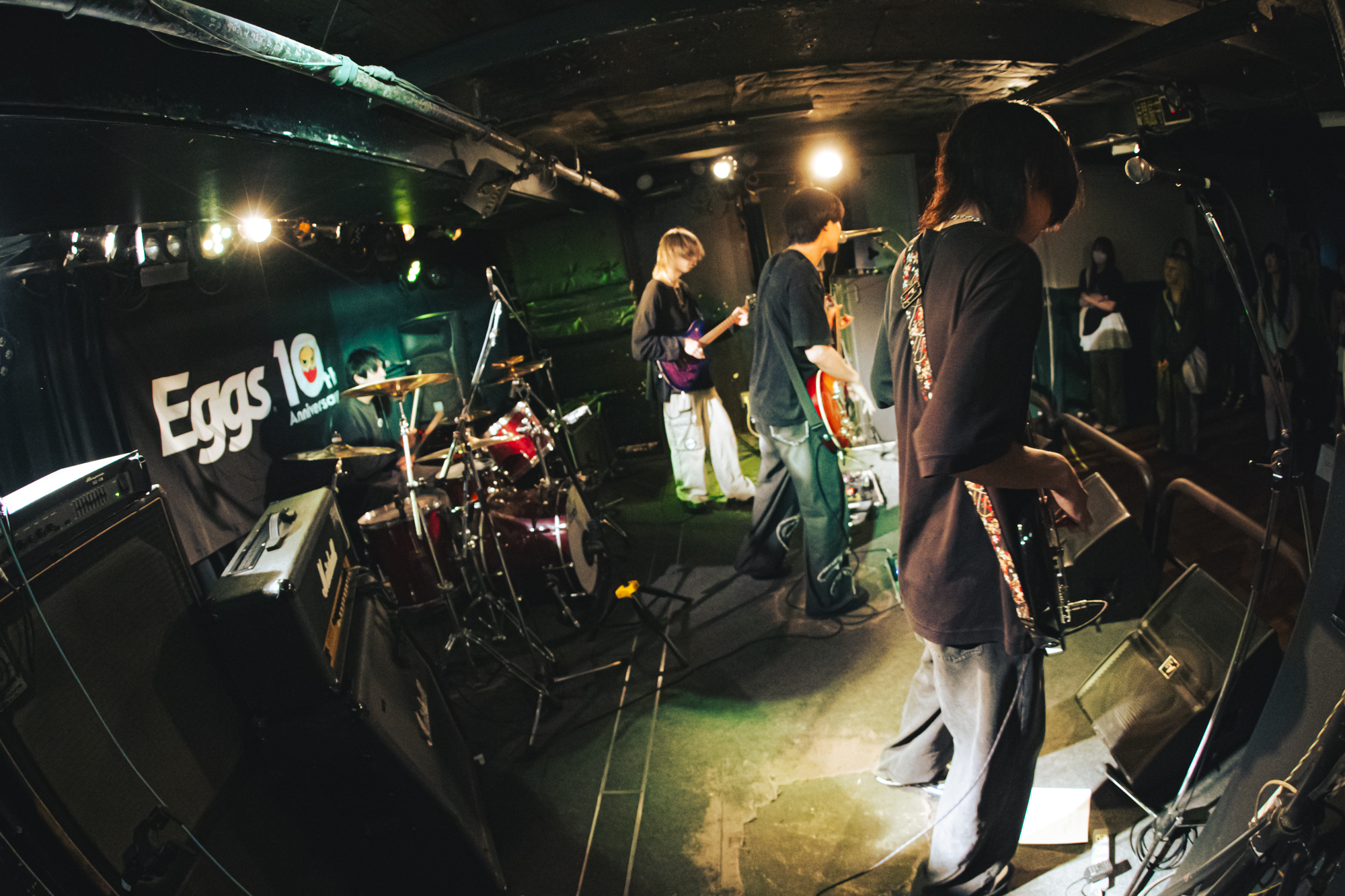 2024年8月に始動した大阪発の3人組ミクスチャーバンド、Shaftray。サポートドラマーが待ち構えるステージにメンバーが登場。「Monster Dance Hall」のダークで重厚なイントロが響く中、「踊ろうぜ!エブリバディ!」と嶋大翔(Vo./Gt.)が叫ぶ。ハンズクラップをするオーディエンスは、のっけからハイテンションだ。続くジャズファンクな装いの「Inside Game」では、ハスキーなハイトーンボイス、リズミカルにカッティングするギター、ファットにうごめくベースラインとパワフルなドラミングがフロアを駆り立てる。「次の曲は楽しくクラップしていきましょう」と嶋が呼びかけ、2025年8月13日にリリースされた新曲「Lost at Sea!!」をプレイ。自然と踊りたくなるアップチューンが、フロアのボルテージを高めていく。「Eggs10周年おめでとうございます。何ごとも長く続けることは難しいと思います。始めることも難しいけれど、それ以上に続けることが難しいなと思います。いろんな理不尽を積み重ねてきた結果が今の僕達であり、あなたであり。人生ってそういうものだと思います。そういう曲を歌います」とエモーショナルなミディアムチューン「Vela」披露。クライマックスは「Antithese」「you and die…???」とパワフルな曲を連発してフィニッシュしたShaftrayは、重厚なサウンドとクリアな歌声のコントラストで、オーディエンスを魅了した。