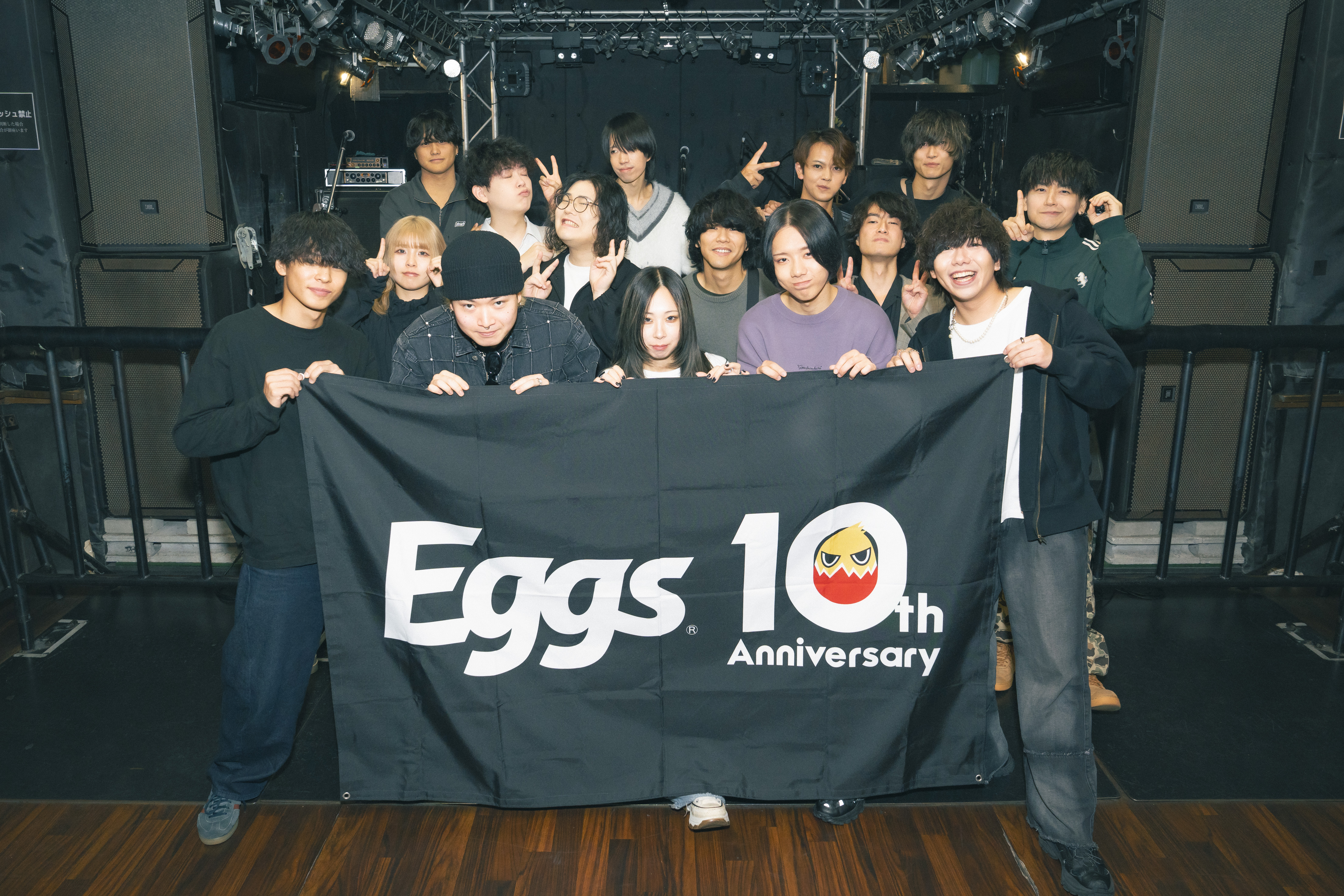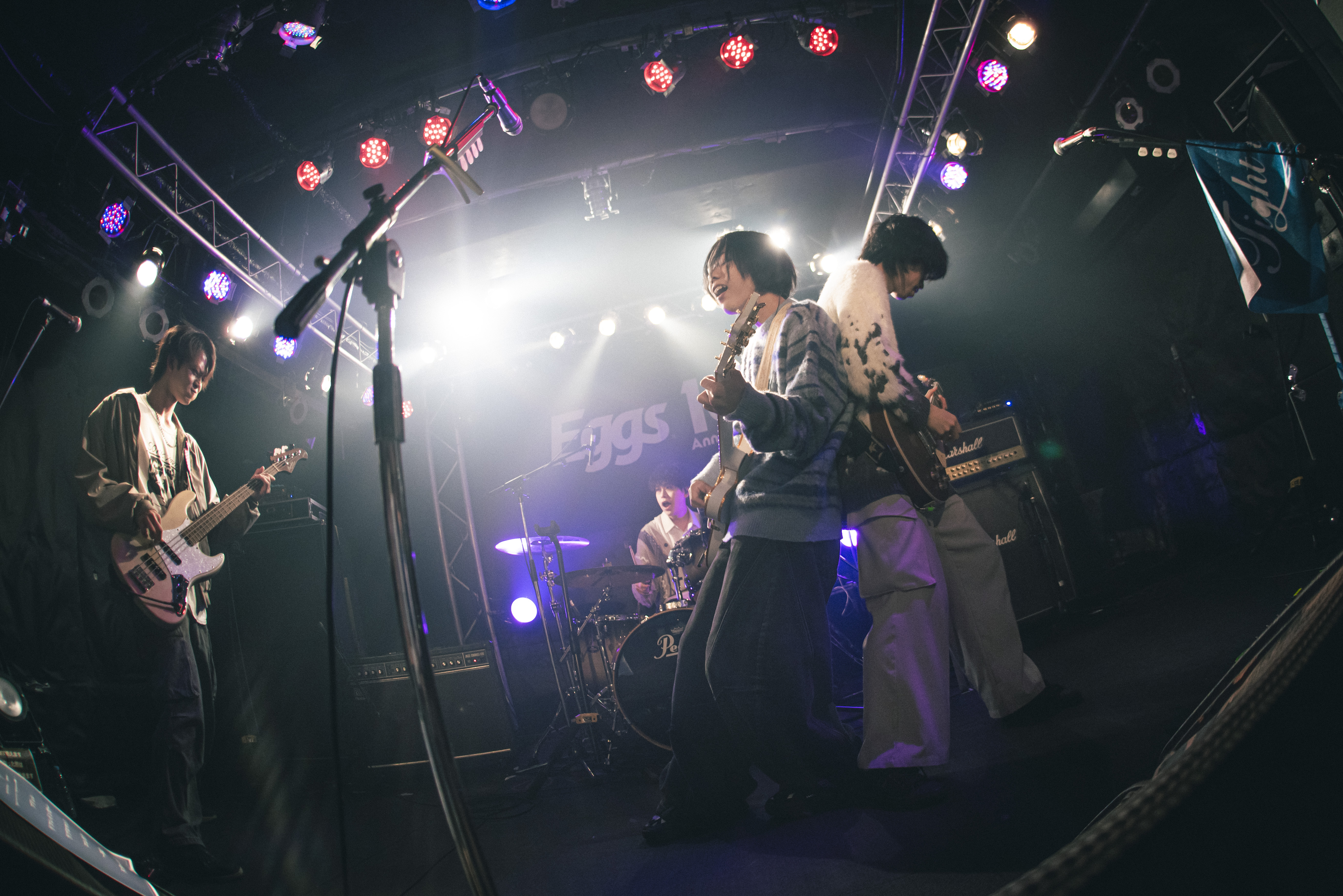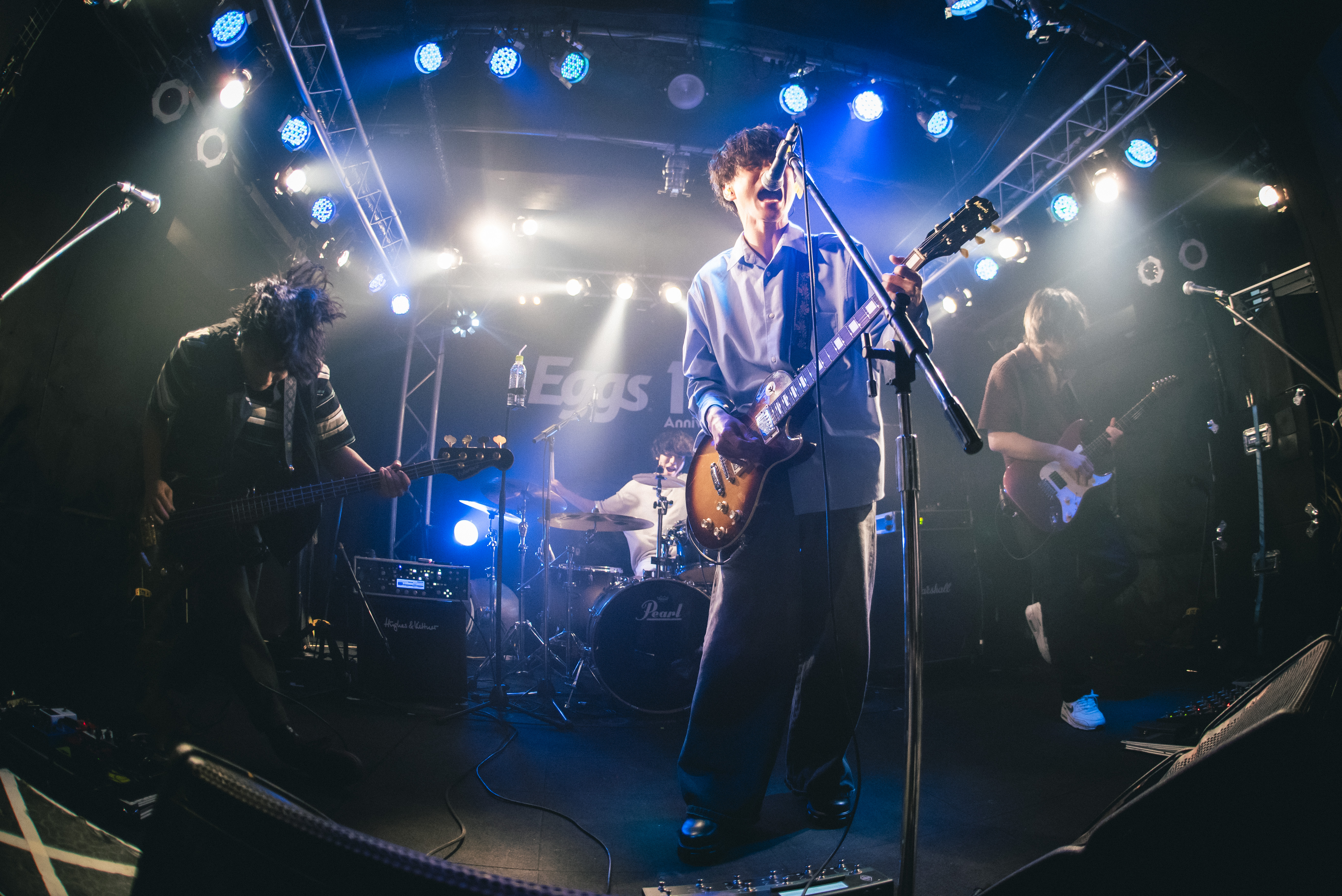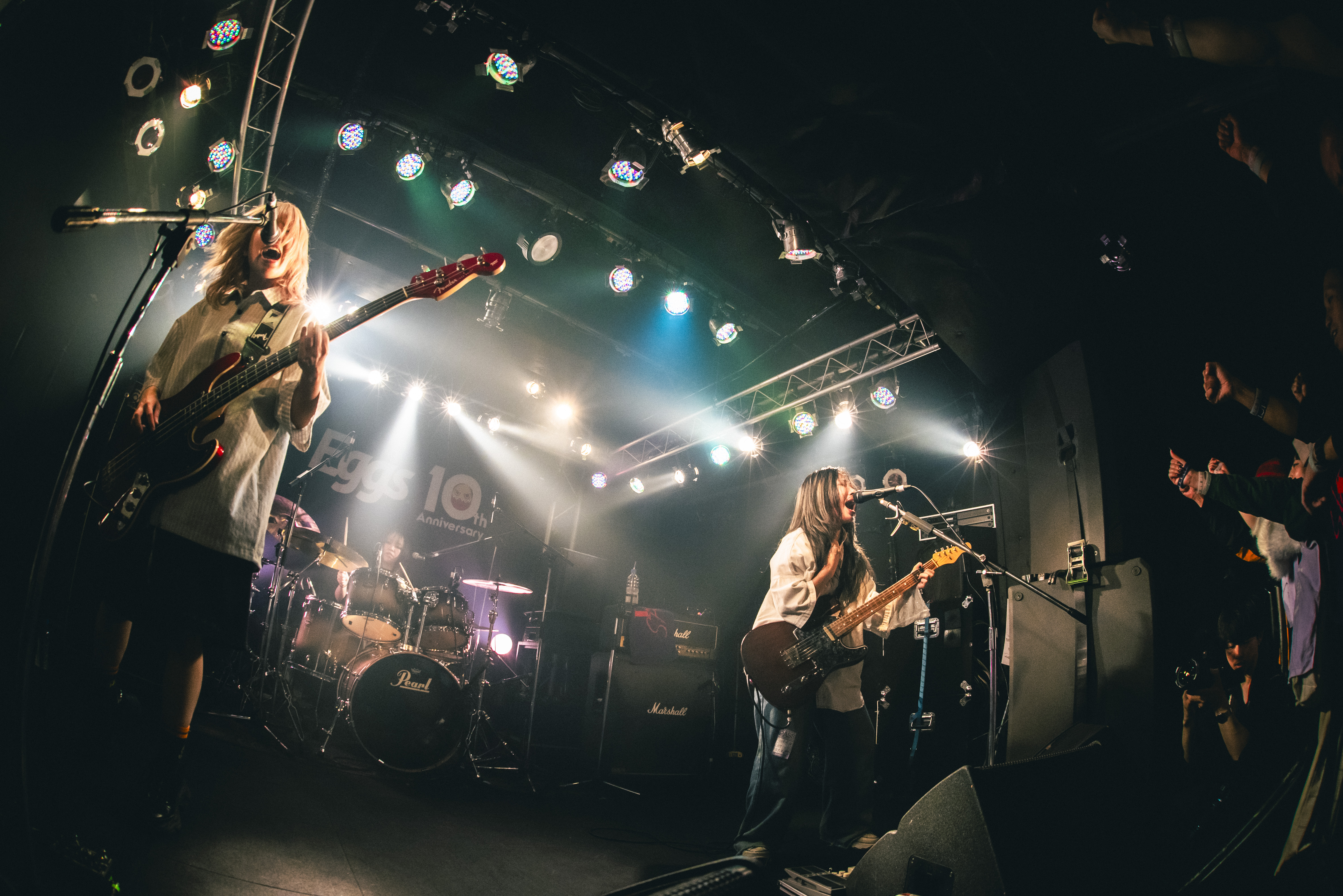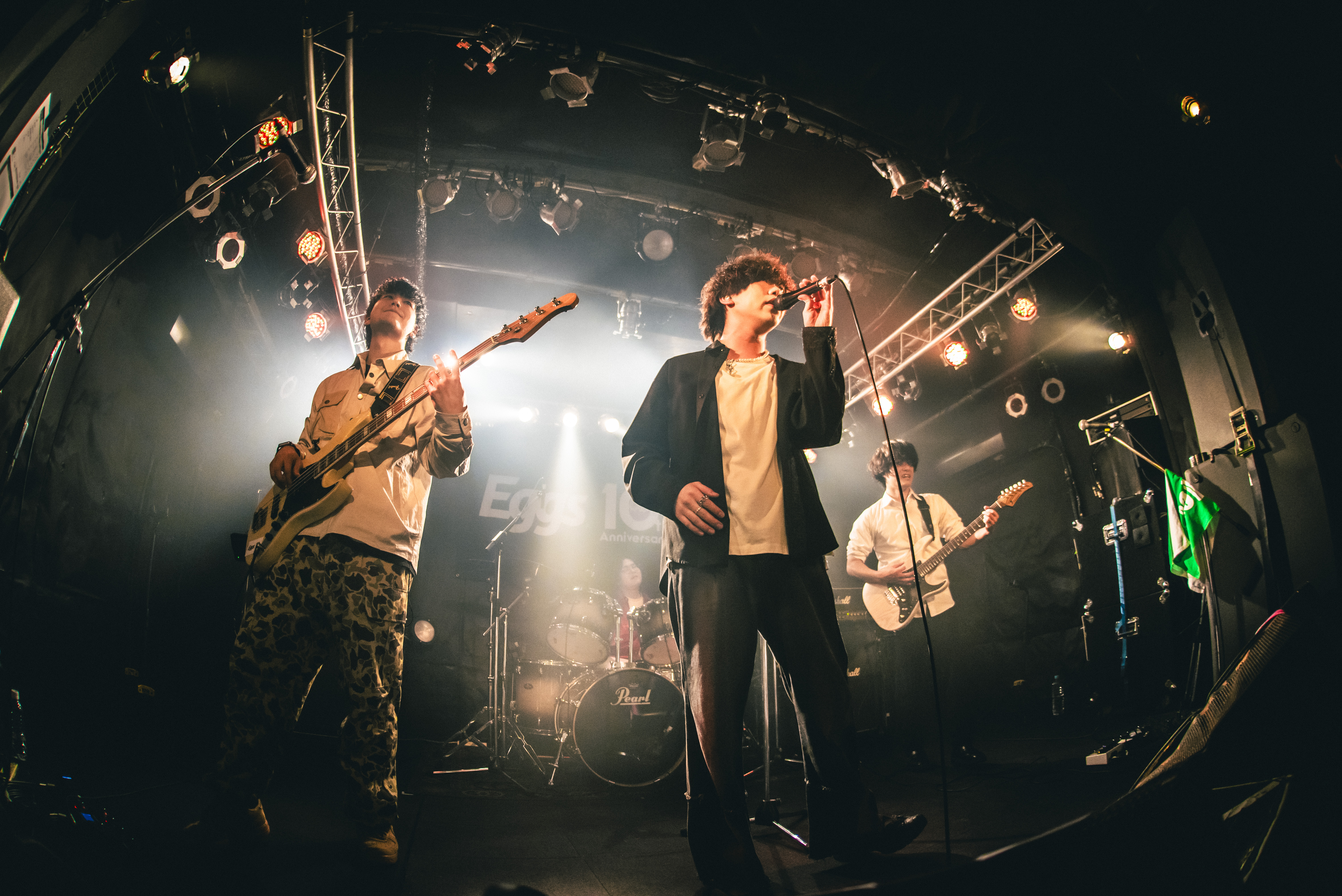 1番手は福岡発の3ピースロックバンド、tight le foolが登場。『ビクターロック祭り2024』のオープニングアクト出演権をかけたオーディションで、見事グランプリを獲得。2024年11月、東京ガーデンシアターの大舞台で、新人とは思えぬ堂々たるパフォーマンスを披露した。その実力を証明するように序盤から勢い全開。「ブリュレ」「リフレインガール」と軽快なロックチューンを畳みかけると、フロアからハンズアップが。比喩や韻を巧みに散りばめた青春と恋の歌詞も、心地よく耳に残る。「Eggsさんには本当に何から何までお世話になっているバンドでして、こうして10周年をお祝いできて嬉しいです。本当にありがとうございます!」と感謝を述べるtight le fool。「最後に僕達の大切な曲を歌って帰ります」と述べ、虚無感と葛藤の中から一筋の光を見出していく「スターナイト」をプレイ。クライマックスでは壮大なサウンドとRIKU(Vo. / Gt.)のパワフルなロングトーンが響き渡り、オーディエンスの心を揺さぶった。