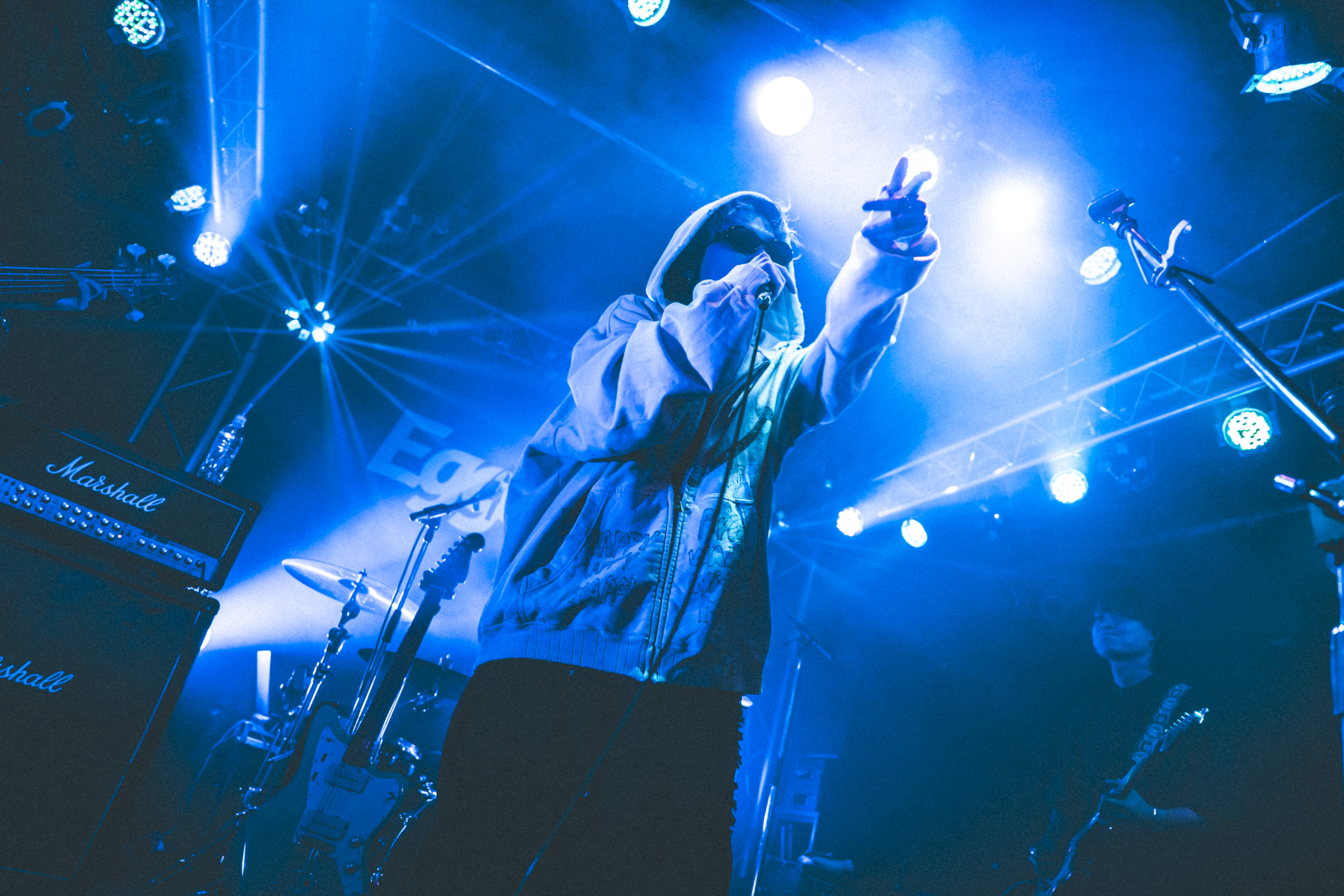 東京を拠点に活動する福岡出身のシンガーソングライター、Iwankof。自ら作詞・作曲・編曲の全てを手がけるマルチスキルの持ち主だ。ギター、ベース、ドラムのサポートメンバーとともに、4人編成のバンドスタイルで臨む。メロウでダークなヒップホップ「ぐちゃぐちゃ」、ポストロックライクな「うんめい」、「悲劇のような喜劇のなかで」とジャンルレスな楽曲を立て続けに披露していく。ハンドマイクで歌い上げる曲もあれば、ギターを鳴らしながら歌う曲もあり、多彩なパフォーマンスを魅せるIwankof。「Eggs10周年に大きな拍手を!」とIwankofが呼びかけると、フロアから大きな拍手が送られる。バンドで音楽活動をしていた頃を含め、この日の出演者の中で活動歴が最長というIwankofは「福岡の先輩が1番カッコいいライブをしないとダメでしょ〜!」と軽妙に煽りつつ、後半はアップチューンで一気に加速。「今日ここにいるみんながずっと幸せで笑顔でいられますように」という願いとともに「VIKA」を演奏。一気に高めたボルテージが冷めやらぬまま、ステージを後にした。