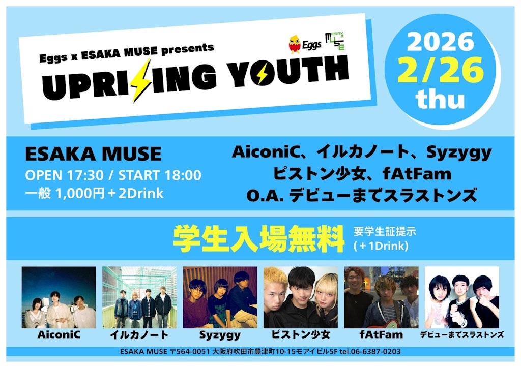 大阪北摂江坂から関西の音楽シーンを盛り上げるべくEggsとESAKA MUSEが共同で企画する、新世代のアーティストを招集した新イベント”UPRISING YOUTH”の開催が決定しました。