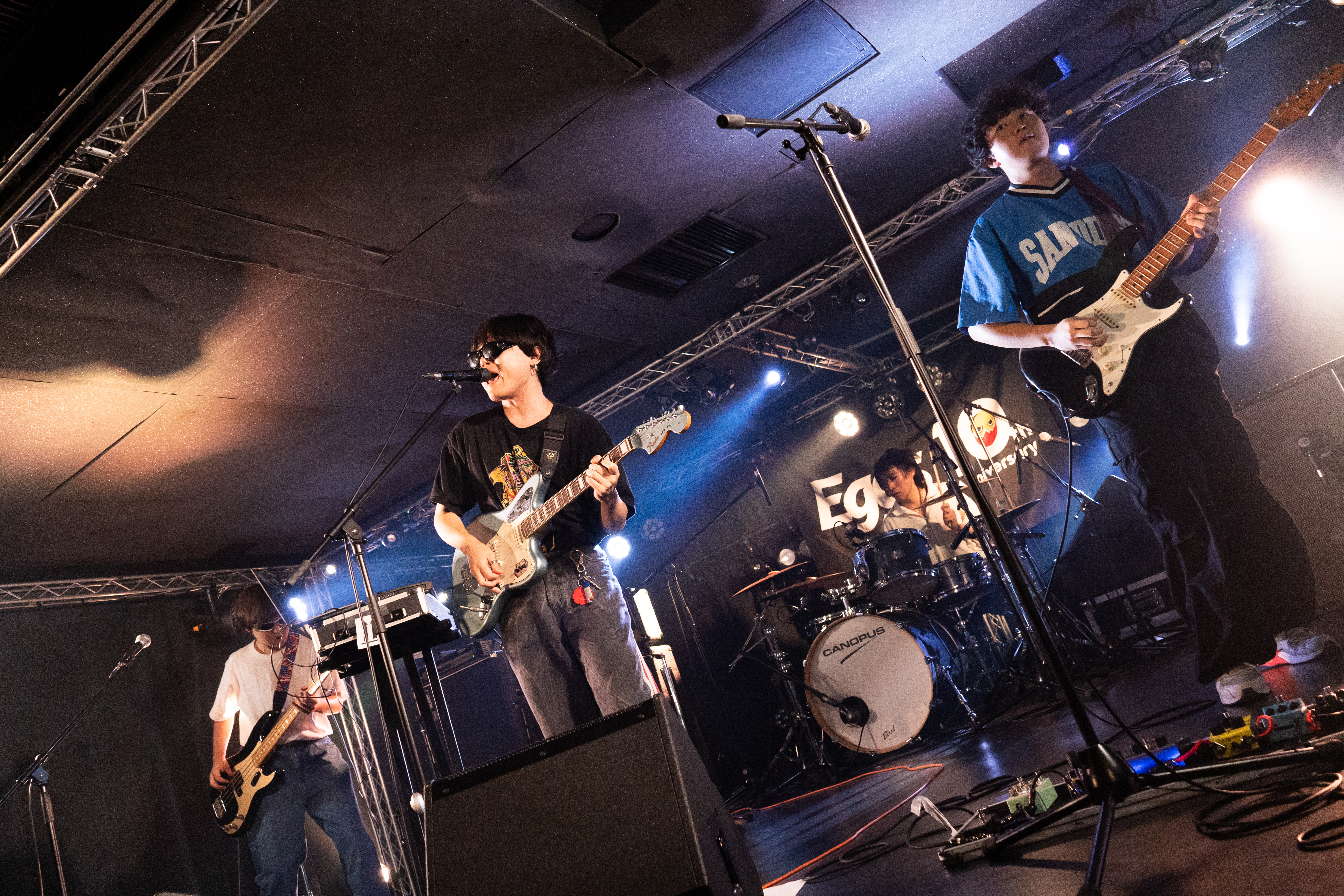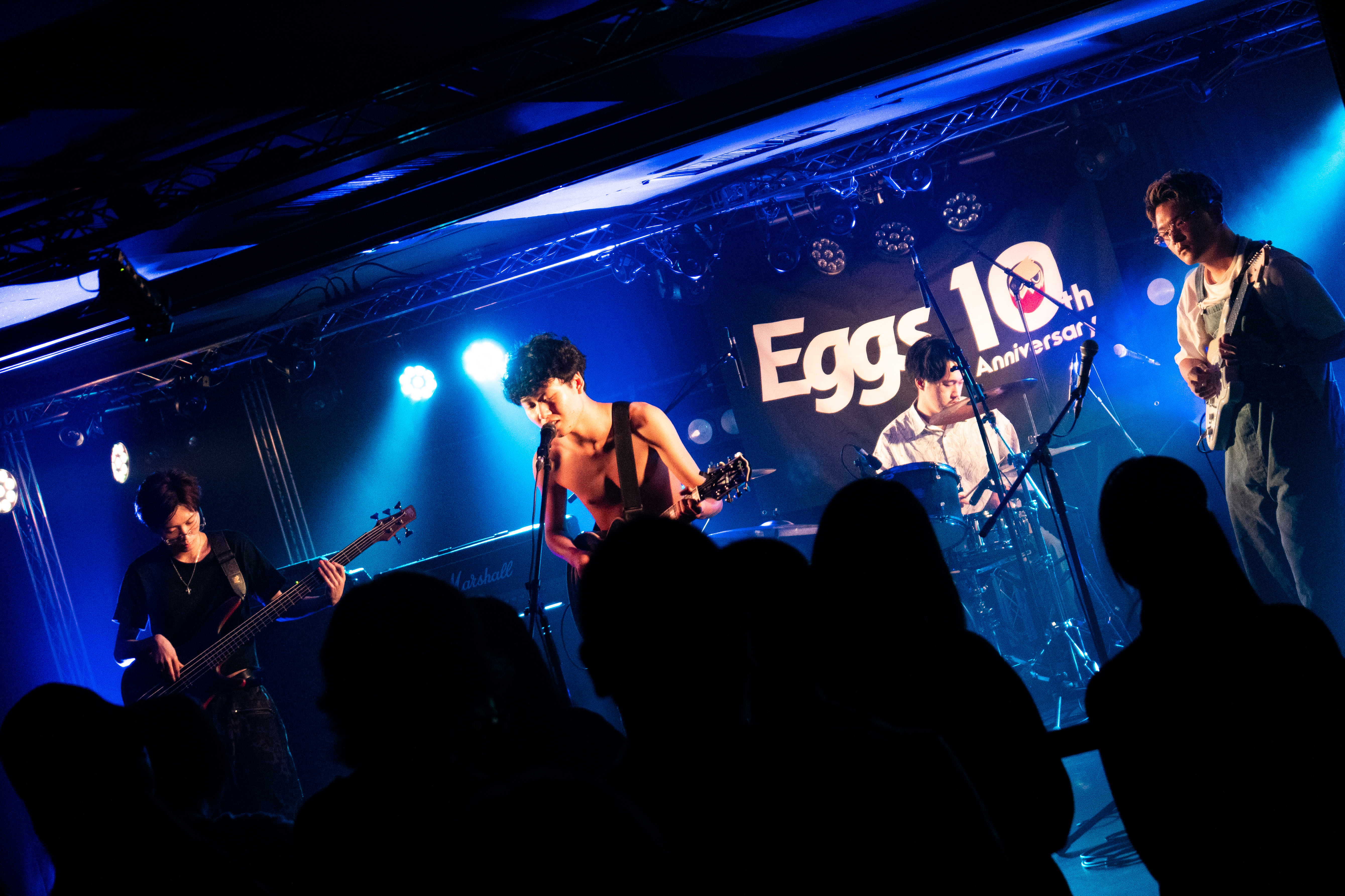 札幌の音楽系専門学校で結成された4ピースバンド、お願いジョンソン聴いてくれ。1曲目は、2025年3月リリースの1stシングル「天国」だ。なだらかなイントロから始まり、サビでは力強さを一気に爆発。フロアの熱気が次第に高まっていく。「Eggs10周年おめでとうございます。10周年の祝いのライブに呼んでもらえて本当に嬉しい」と喜びの言葉を述べた後、「お客さんがめっちゃ多くて有名人になった気分です(笑)」とジョークを飛ばし、オーディエンスの笑いを誘う。この日初披露となる新曲「愛のほつれ」は、静寂の中から徐々に感情が高まるかのように、次第に歌声とサウンドがエネルギッシュになっていく。情熱的に緩急をつけた楽曲は、彼らの魅力のひとつだろう。終盤になると、石崎聖五(Vo./Gt.)がおもむろにTシャツを脱ぎ、上半身をさらけ出す。そして石崎は「ある場所で弾き語りの人の歌に感動して泣いてしまった。そんな曲を作りたいと思って作った曲」と言い、ラストの「タイムマシン」をプレイ。感情を爆発させたサウンドで、オーディエンスの心を高鳴らせた。