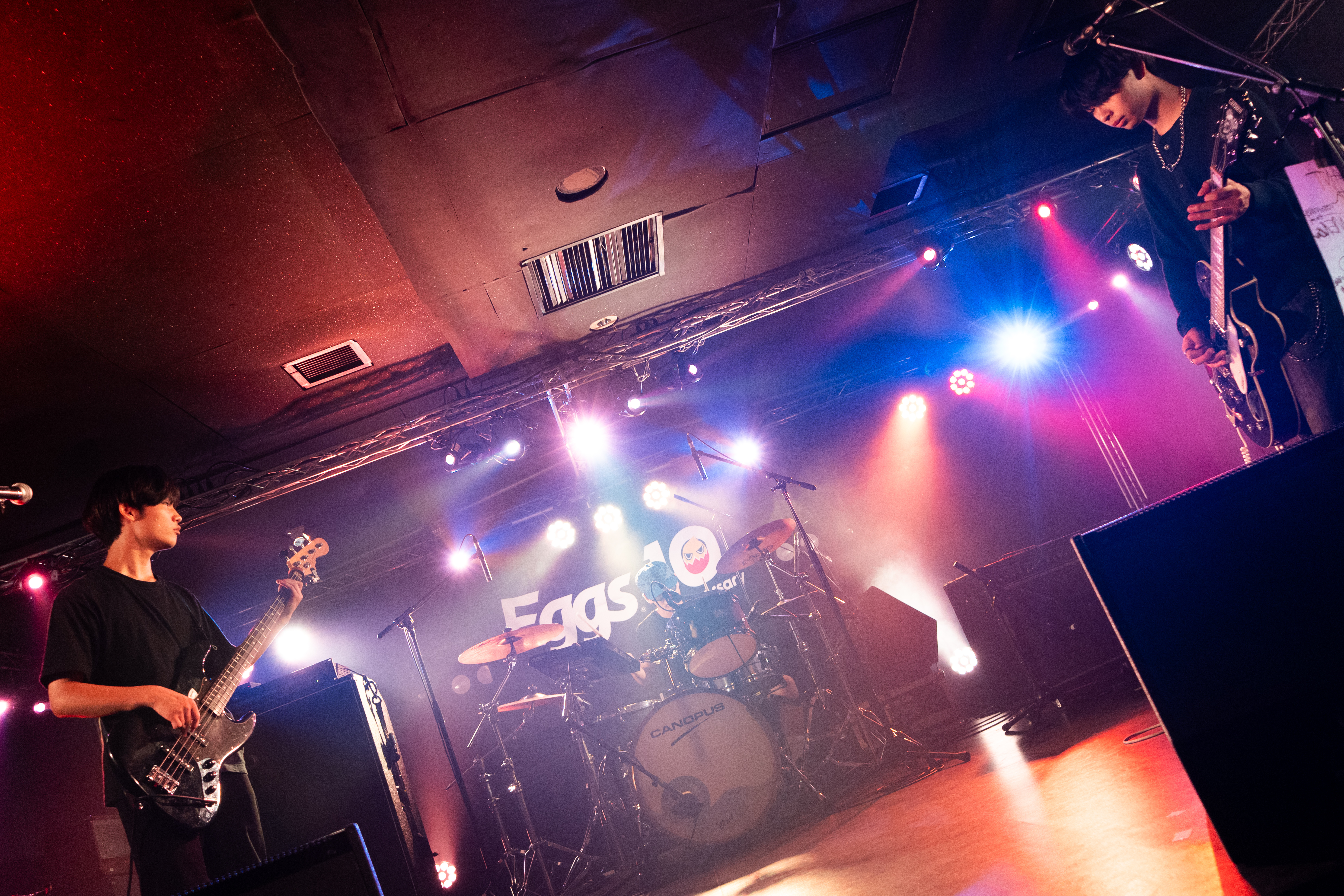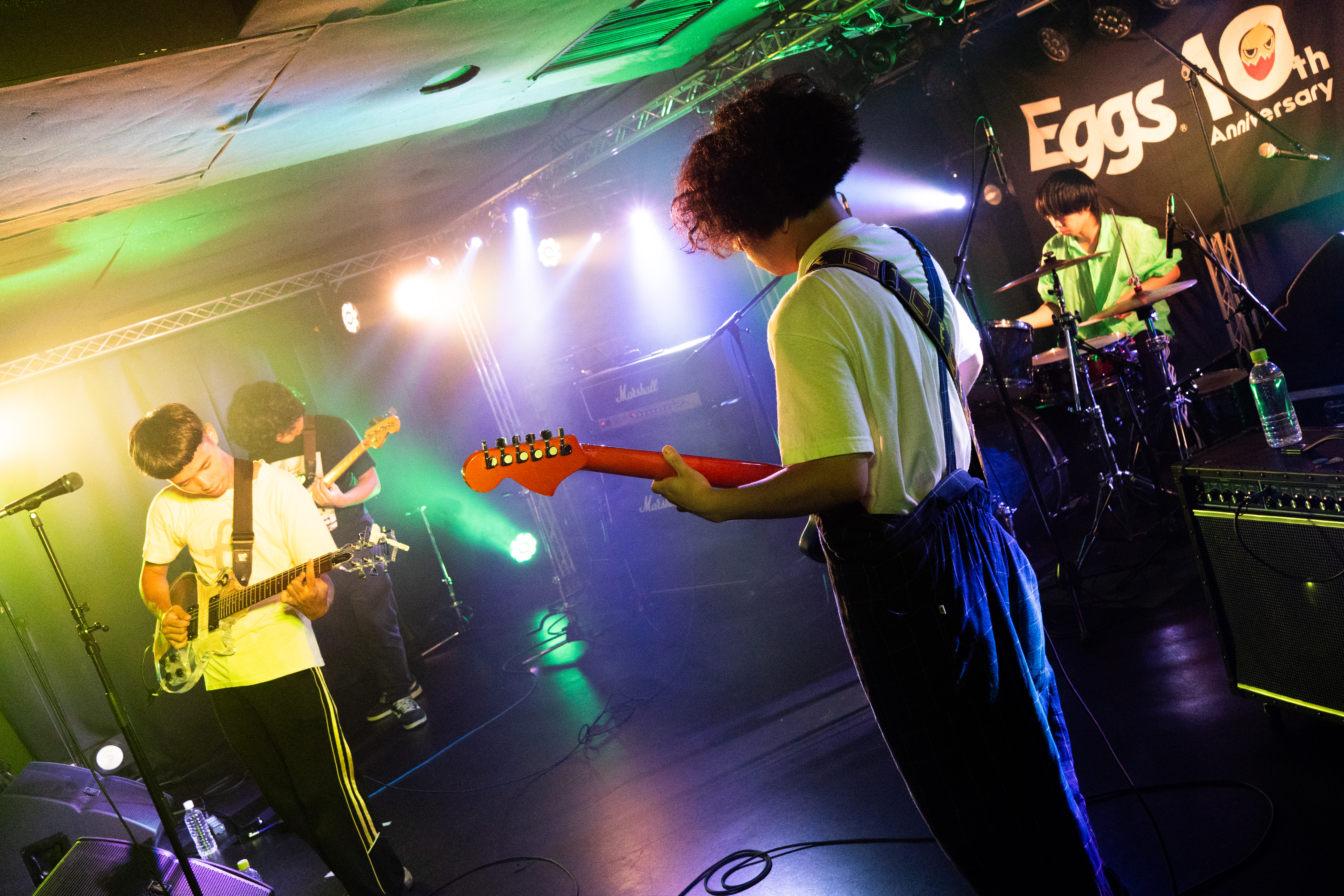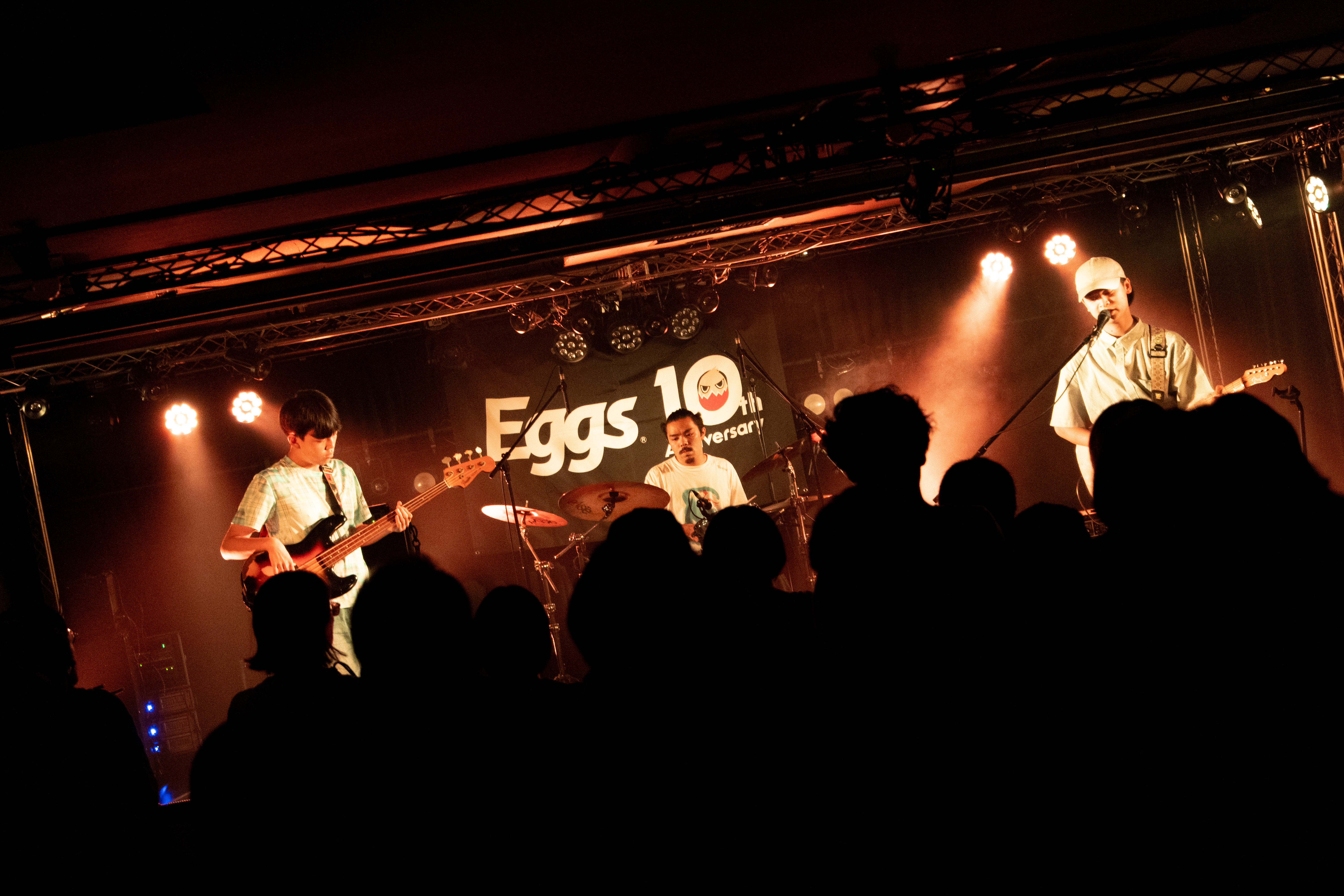 オープニングアクトは札幌発の高校生3ピースバンド、The Finksだ。ブルーのライトに照らされた暗がりのステージに3人が登場。ギターとベースの不穏なノイズが鳴り響いた後に骨太なサウンドでこの日の幕が開ける。強く歪んだギター、重厚にうねるベース、タイトに変則ビートを打つドラムに加え、がなり声で叫ぶようなボーカル。グランジ全開の熱を帯びたサウンドに、オーディエンスは飛び跳ねるように体を揺らす。「Eggs10周年の記念で全国4カ所をまわるツアーのオープニングアクトに誘っていただいてありがとうございます」とチバ(Vo./Gt.)が御礼を伝える。1980年代から90年代初頭に隆盛したグランジロック中心の楽曲を披露するThe Finksは、現在高校3年生。受験に専念するため、この日が年内最後のライブになるという。「また来年会いましょう。最後に12月に出す新曲を。SNSのチェックお願いします」と活動休止中に音源をリリースすることを告げ、穏やかなミディアムチューンの新曲を披露した。彼らは「また来年戻ってくるので、来年も(ライブに)来てほしいです」とオーディエンスと再会を約束をし、それぞれの挑戦のステージに旅立った。