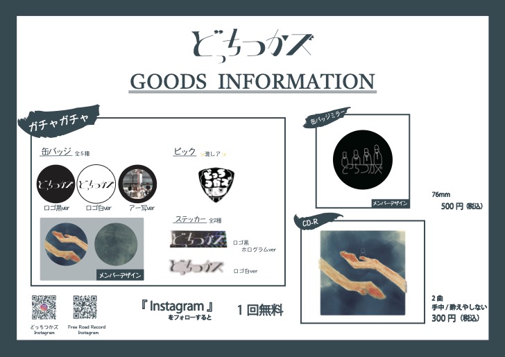 最後に、物販で実際に売っているオリジナルグッズの紹介をしたいと思います! 1つ目は遠藤さんが描いた絵を使った缶バッジ型のミラー、2つ目は現在各サブスクでも聴くことの出来る『手中』『酔えやしない』の2曲が収録されたCDです! どっちつかズのライブにお越しの際には是非お買い求めください!
