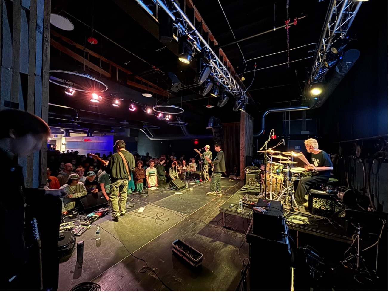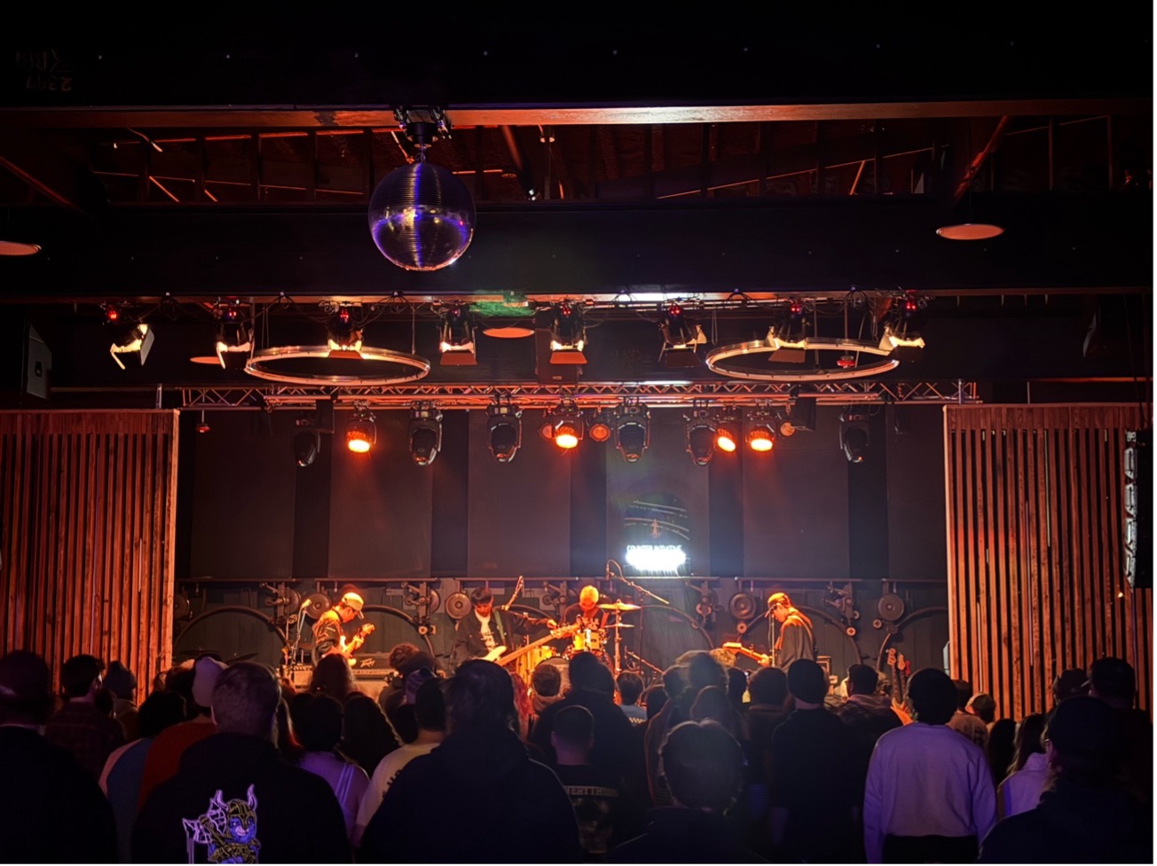 出番を終え、頂いたフードチケットで交換できるデカハンバーガーにかぶりつく。うめぇ。その後はライブを観にフロアへ。皆んなはBay Factionというバンドは知っているだろうか?このツアー全日程一緒に出演してるバンドなのだが、初日にライブを観て一目惚れ。めちゃくちゃカッコいい。今ではすっかりファンになってしまった。Counter Intuitive Recordsからリリースしてるバンドなのだがそのレーベル特有のキャッチーで明るいイメージとは異なり、かなり暗めでUK味のあるインディーロックバンドだ。このツアーでは音楽性的にも黒スーツを身に纏いライブする辺りもかなり異色を放っている。音数が少なくポストロック、ジャズの要素も感じてセンスの塊。好き。