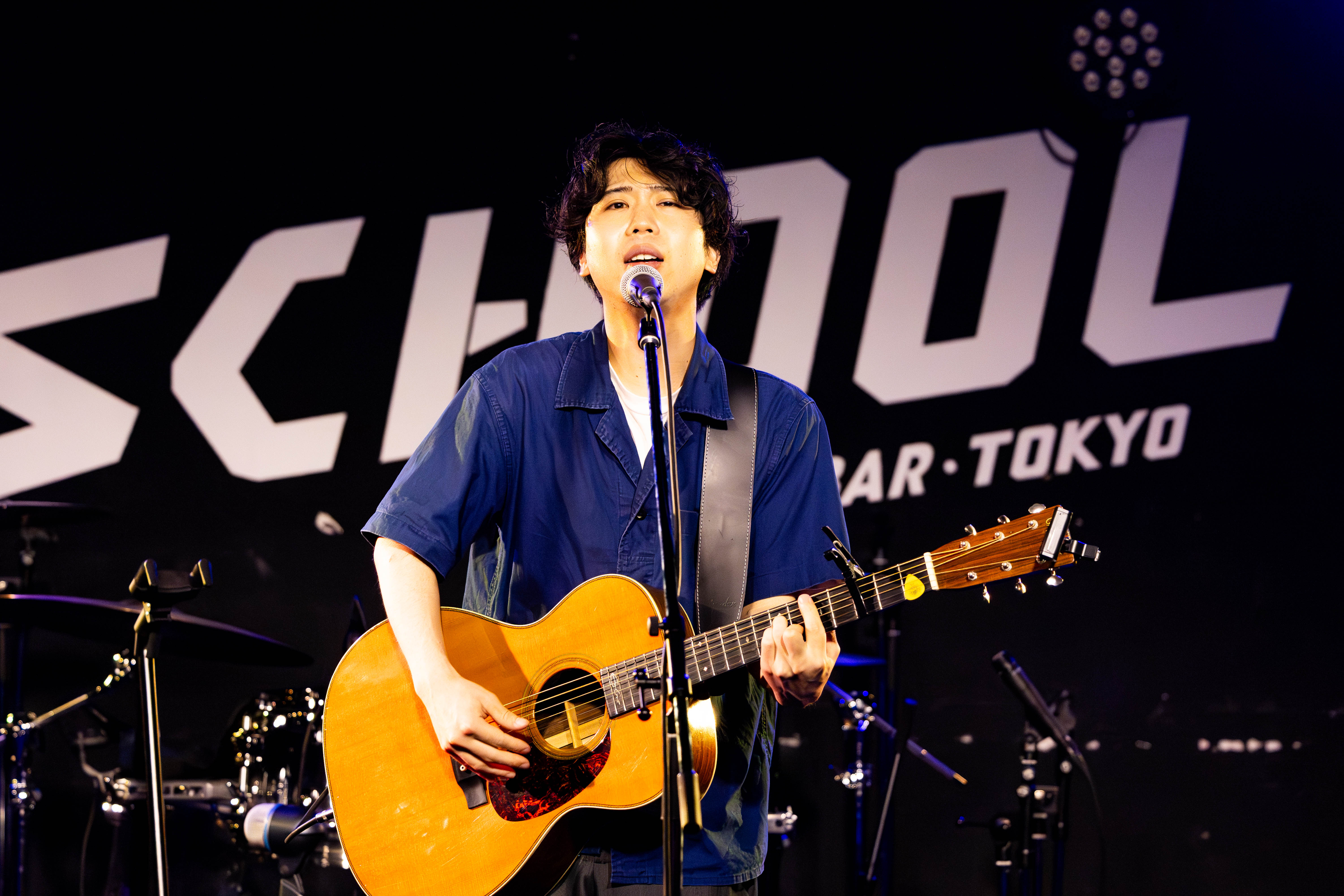 1番手に登場したのは京都生まれ愛知県豊橋市出身のシンガソングライター、滝沢ジョー。『J-WAVE TOKYO GUITAR JAMBOREE 2023 supported by 奥村組』の出演をかけたオーディション企画「SONAR MUSIC Road to RYOGOKU」で優勝し、両国国技館の舞台に立った経歴を持つ。SCHOOL TOKYOのステージに登場した滝沢ジョーは、温かみあるアコースティックギターの音色と、心ににじむ歌声を場内に響かせ、聴く者を魅了していく。「ここ2年ぐらいはアレンジや編曲まで自分でやって、弾き語りの作品を出したり、他のアーティストへの楽曲提供とかアレンジも行い、音楽に食らいついて生きてこれました」と胸の内を語る。ラストは、上京した滝沢ジョーが、故郷から届く荷物に詰められた“愛情”を歌にした「ダンボール」をプレイ。ハートウォーミングかつ哀愁漂うサウンドとリリックで、心に光を灯す歌声をフロアに届けた。