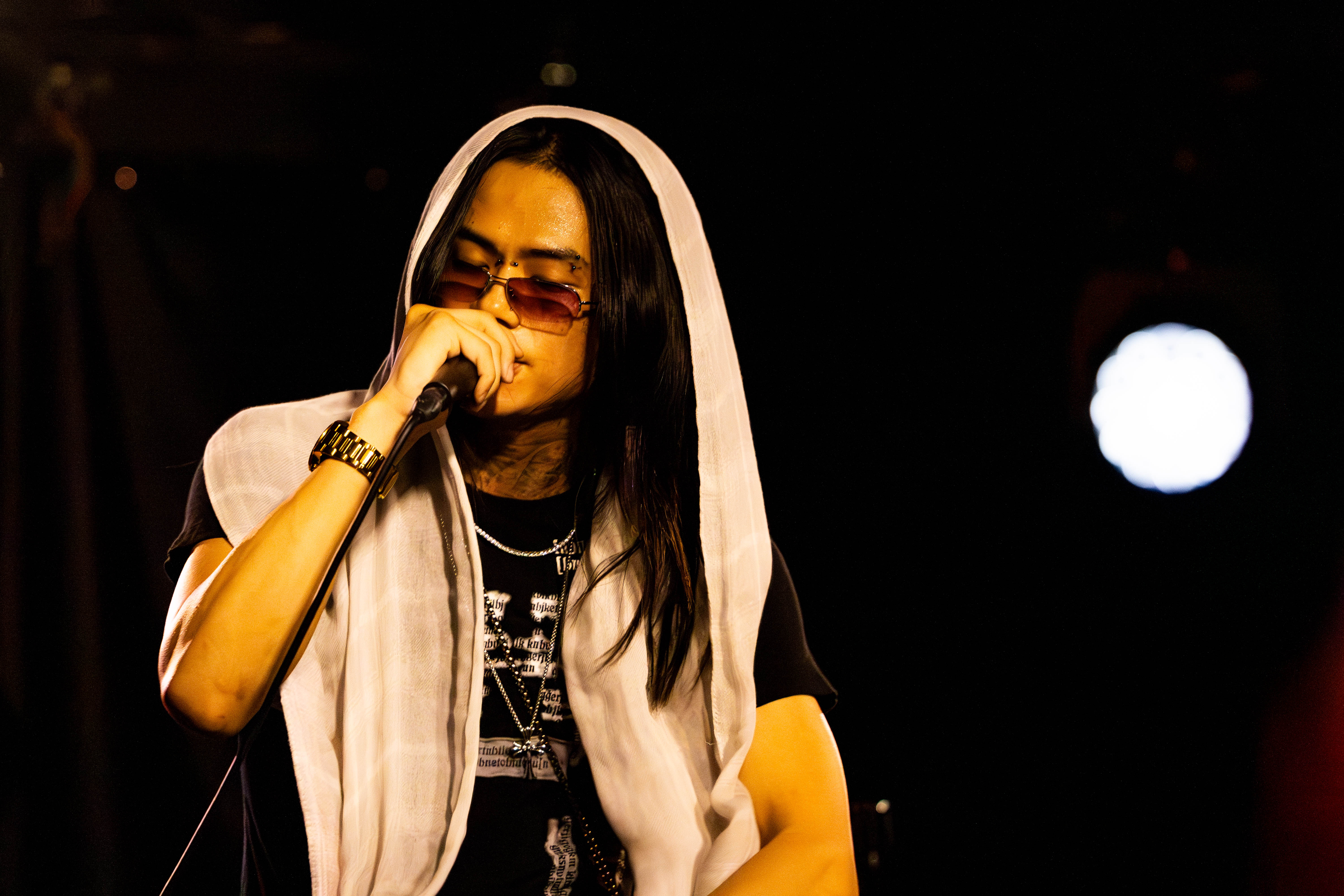 東京を拠点に活動するラッパー、$horyu。取材前にリサーチをしてみても、詳細な情報がなかなか見つからず、謎に包まれていた彼は、1MC1DJのスタイルでステージに登場。頭に被った薄手のストールの片側を首に巻き、サングラスという出たちでミステリアスだ。気怠くアンニュイな雰囲気を醸し出しながらステージを動きまわり、エフェクトのかかったラップを刻む。アッパー、ダーク、チルなトラックや、三味線のような和のサウンドが印象的なトラックまで、多彩なテイストのトラックを披露。終盤には頭に被っていたストールを肩にかけ、長髪を露わにした$horyu。短い持ち時間の中、ストール1枚で様々なファッションを表現しているようだ。「東京で活動していて、ヒップホップ、テクノ、エレクトロニクハウス、いろんなジャンルやってます。新しいことが大好きなんで、これからもチェックよろしくお願いします。あざっした」とフロアに挨拶をした$horyuは、脱力感ある独特の熱量で勝負に挑んだステージだった。