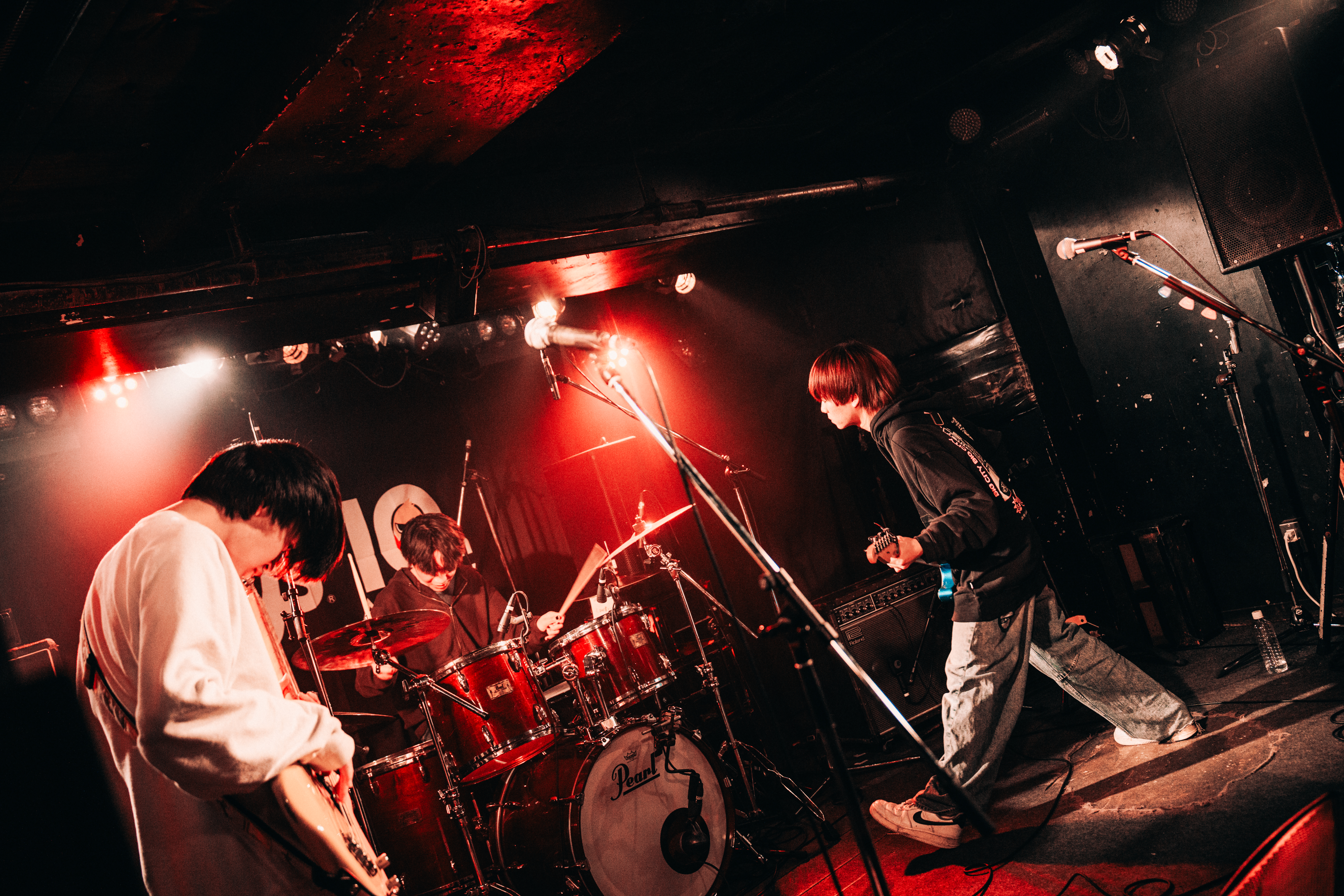2025年夏結成の3ピースバンド、アオジャシン。なほこ(Vo.)、ナツメユウタ(Gt.)、アサヒ。(Ba.)の3人と、サポートドラマーの4人編成で、バンド初のライブに臨む。記念すべき1曲目は「おどるドール」。歌謡曲テイストのメロディと、なほこの透明感ある歌声に聴き入るオーディエンス。「Hello Hello」では、軽快なドラムにきらめくギターとソフトなベースラインが重なり、フロアを爽やかに包む。「今日が初めてのライブになるので、最後までみんなで盛り上がっていけたらなと思います」というなほこの言葉の後に、きのこ帝国の「金木犀の夜」のカバーをプレイ。彼らのバンド名の由来であるきのこ帝国は、彼らがリスペクトするアーティストの1つだという。各サブスクリプションサービスで配信中の「猫背」は、情感たっぷりに歌い上げるなほこの歌声が際立つ。言葉とサウンドを1つひとつ丁寧に紡いでいくアオジャシン。きめ細やかな彼らのスタイルによって、今後どのような楽曲が生まれるか楽しみだ。
