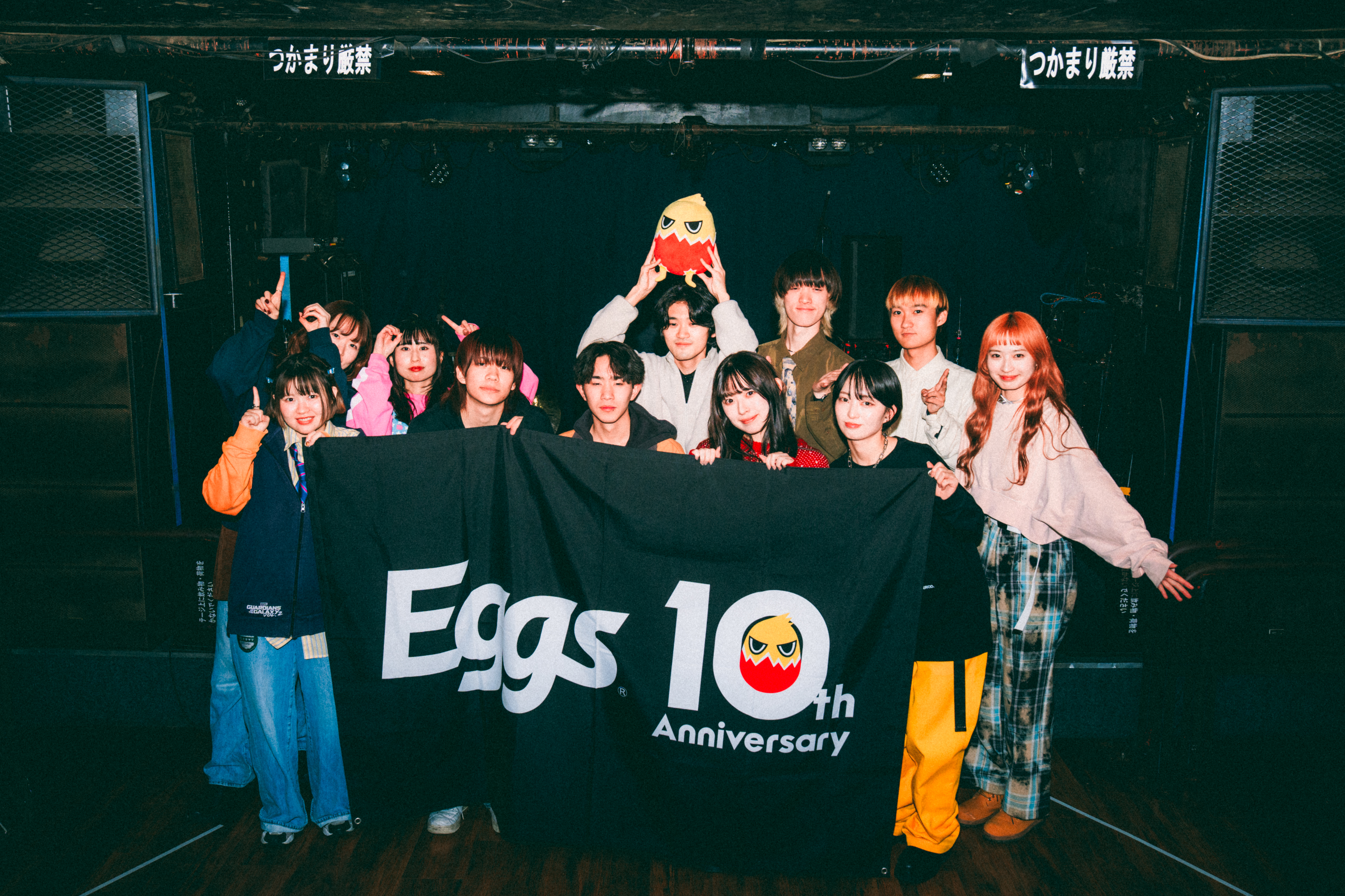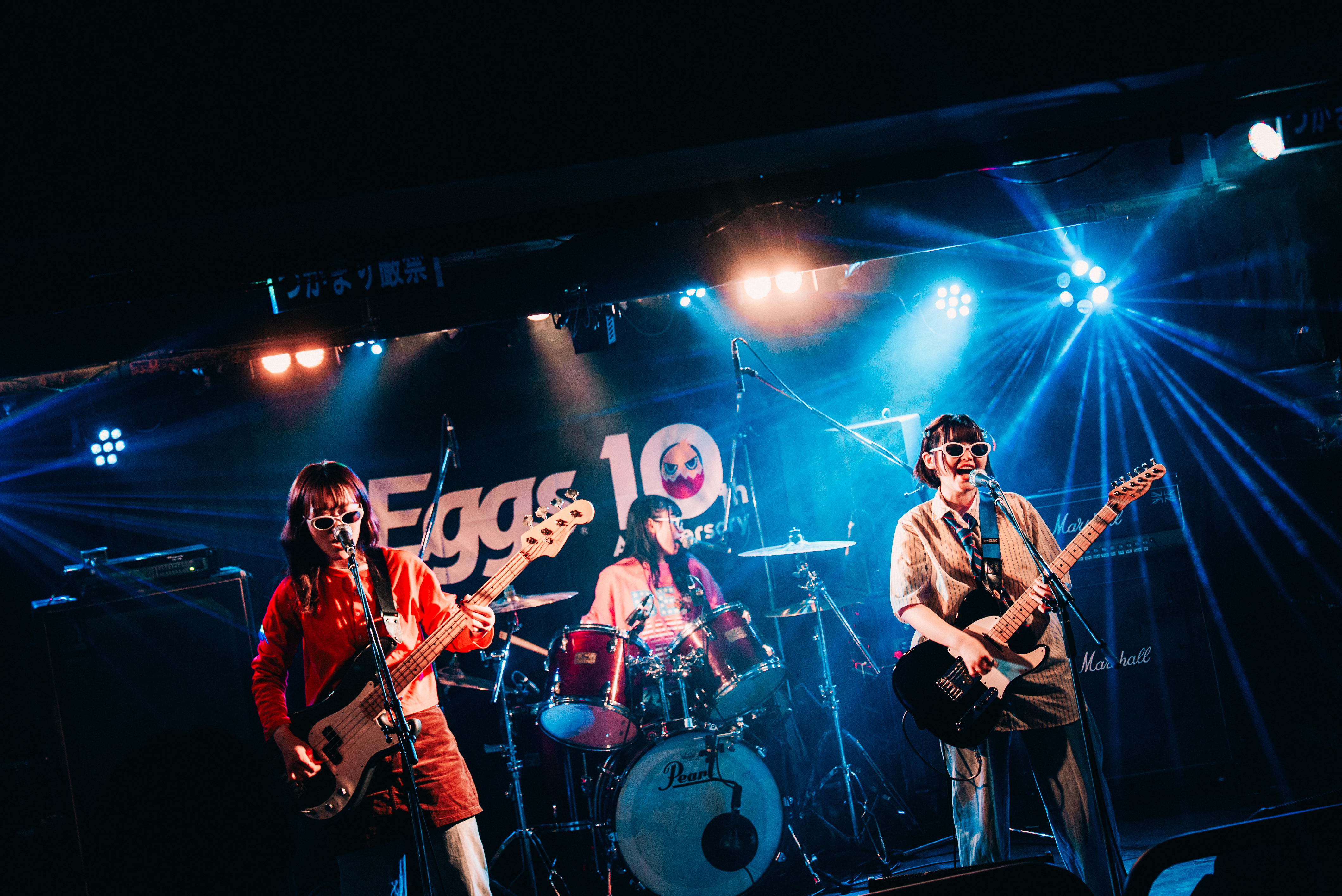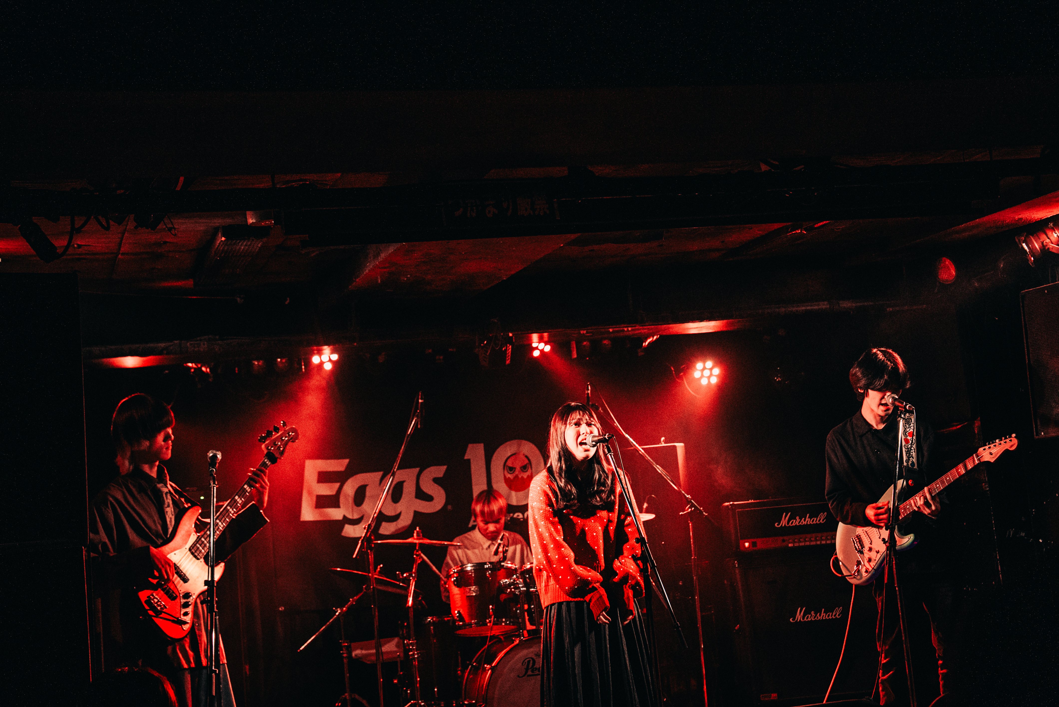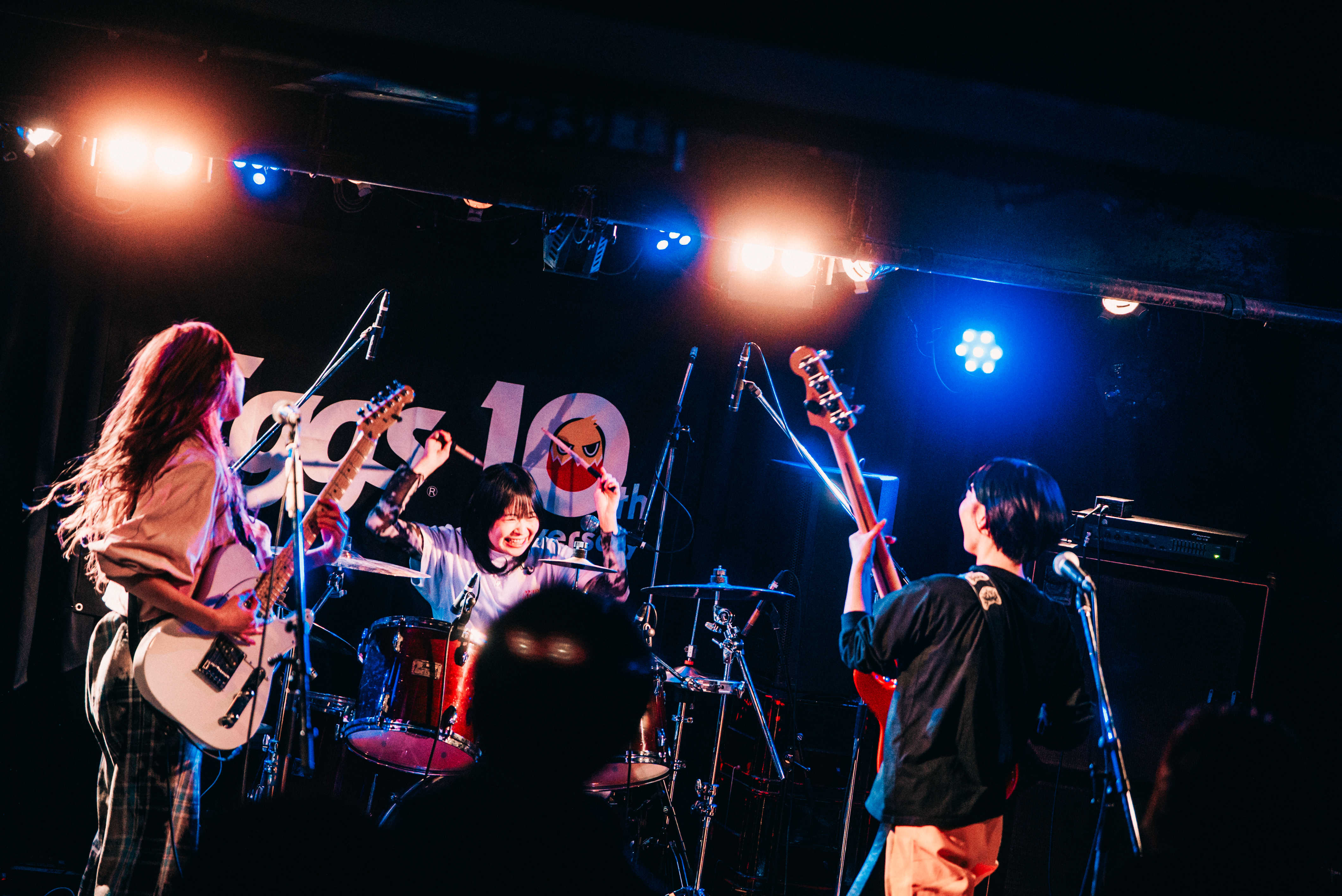 下北沢を拠点に活動する神奈川県発の2ピースバンド、43dB。2025年11月12日に、あのね。から43dBに改名後、この日が初のライブ出演となる。えた(Vo. / Gt.)と、改名と同時にメンバーに加入したのま(Ba.)がステージに元気良く登場。「よろしくお願いします!」と挨拶をした後、「とんだ愛とバイト」「まねっこ」とメロディアスでドライブ感ある楽曲を演奏。勢いのあるステージに、フロアはハンズアップを送る「神奈川から来ました、43dBです。Eggs10周年に呼んでもらってありがとうございます! 次の曲はめっちゃ楽しい曲なので、手拍子を」とオーディエンスに促し、翌日0時に配信リリースの1stシングル「君&中毒」をプレイ。Cメロでは、えたの伸びやかなアカペラが響き、のま(Ba.)はスラップを披露。ミディアムチューン、「あなたに染められて」では、<私と出会ったのはEggsの音源を聴いたからで>と歌詞を変える粋な演出を見せる。「君とバンド」「くだらない」で疾走する勢いでクライマックスを駆け抜け、43dBの新章を近松に刻みつけた。