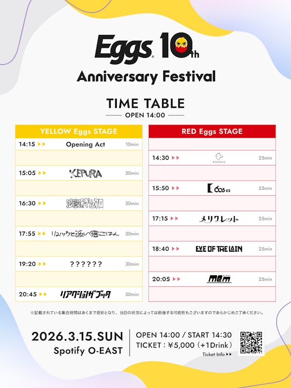 その他詳細は「Eggs 10th Anniversary Festival」イベントページにてご確認ください。