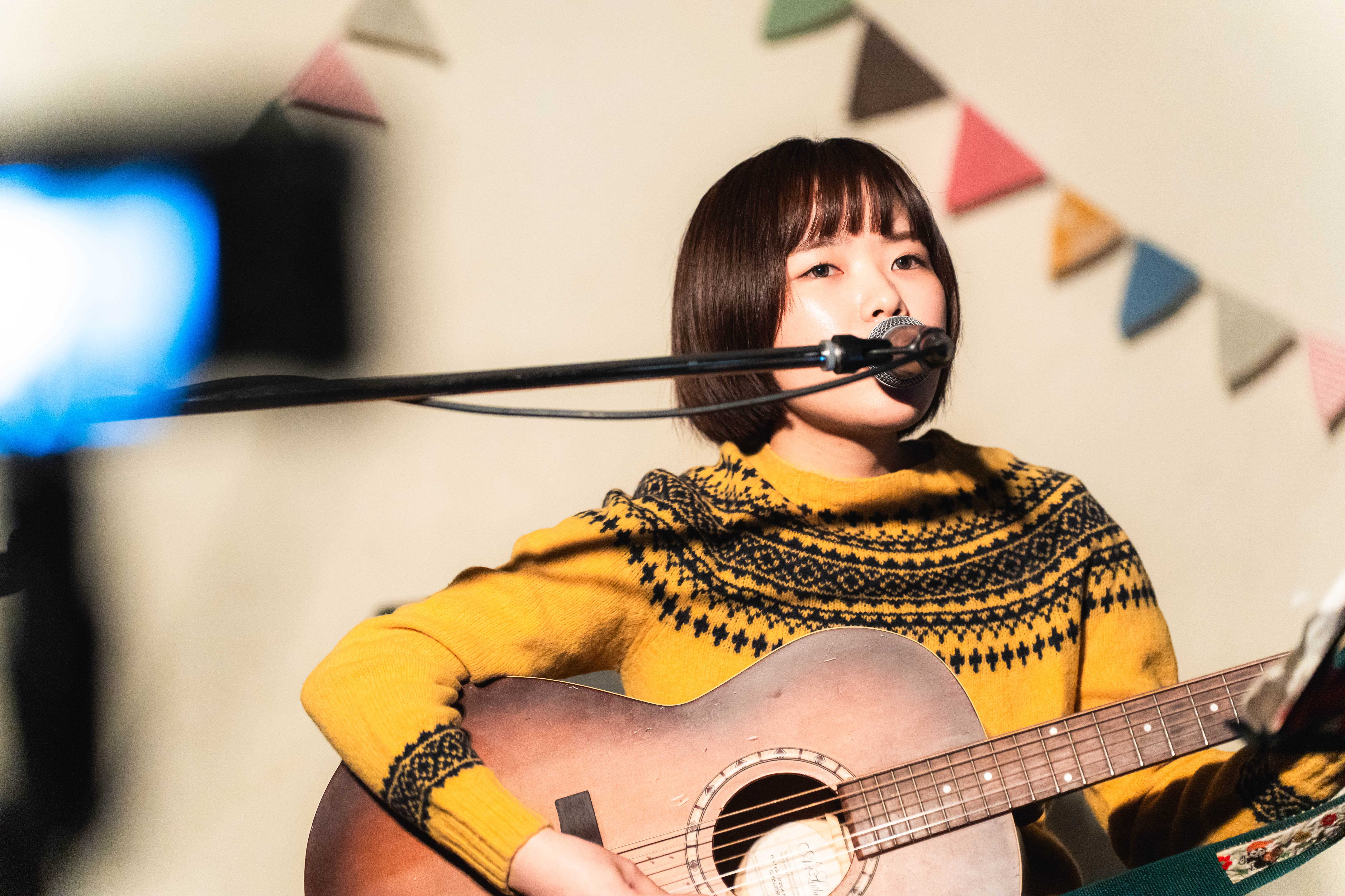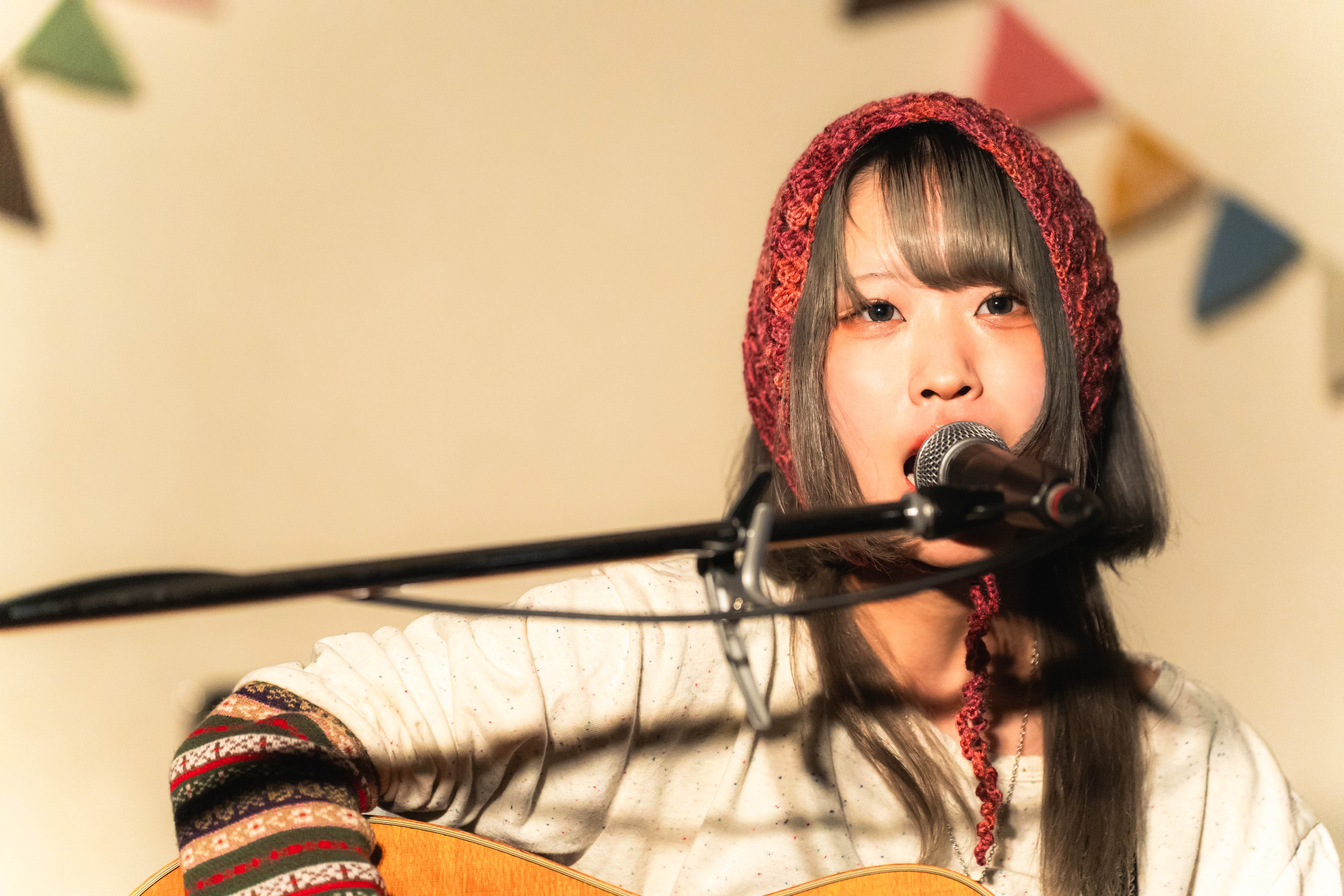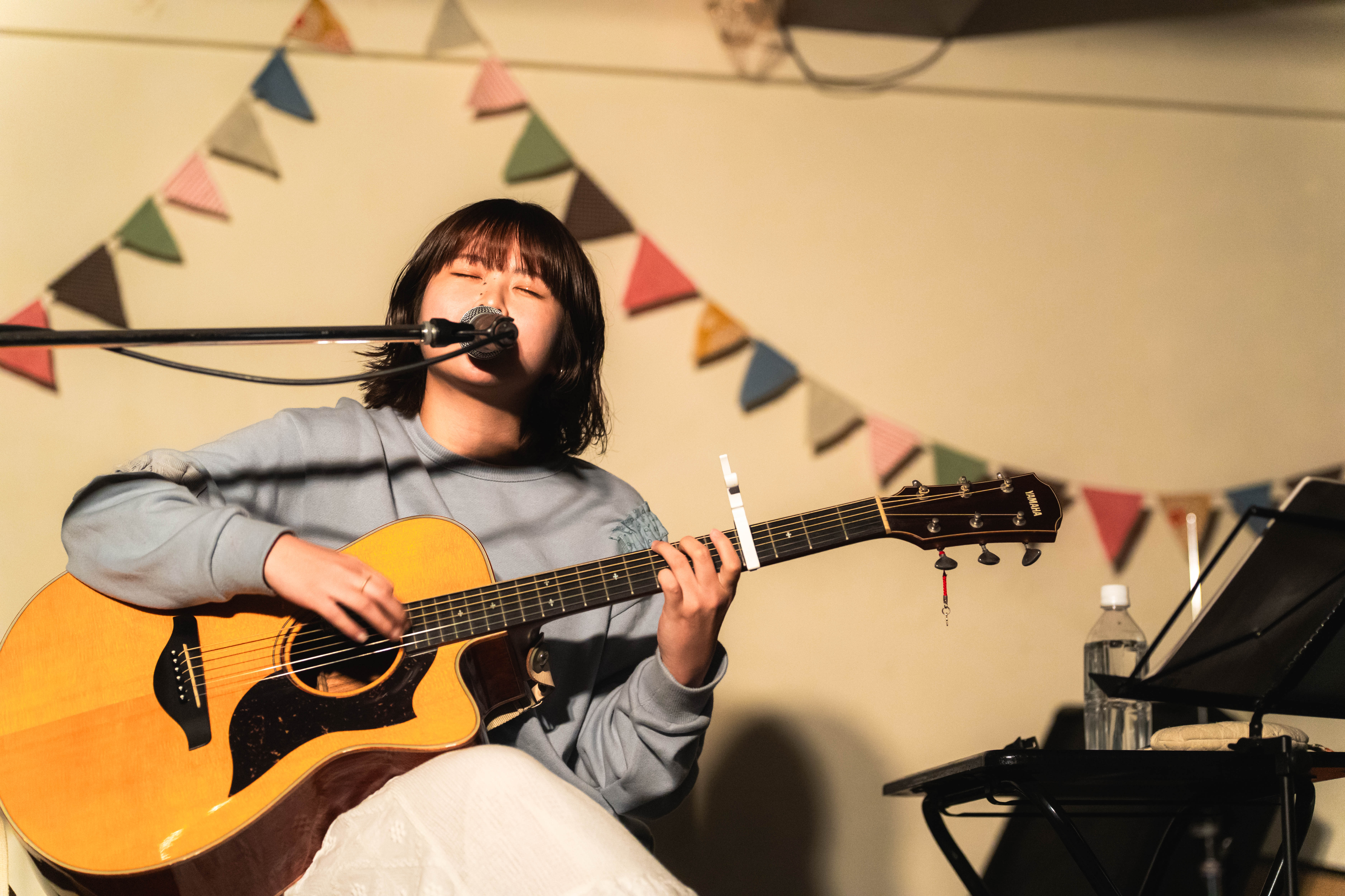 東京都を拠点に活動するシンガーソングライター、杏結。ゆっくりとアコースティックギターを奏でながら「twilight」をプレイ。温かくも切ないメロディと、透明感のある歌声が場内に響く。続く小気味よいサウンドの「行き先」、日常のささやかな幸せを歌う「cakes」を披露し、柔らかな笑顔を見せながら穏やかなサウンドを紡いでいく。「今日、無料配信があるよって、実家にいるお父さんとお母さんに言うのを忘れたなって」と、演奏の途中で思い出したことを語ると、フロアからふふふっと笑い声がこぼれる。「楽な姿勢で最後まで聞いてもらえたら嬉しいです。最後まで幸せに演奏します」と穏やかに語り、「魔法の夜」へ。クリアなファルセットとパワフルなロングトーンを自在に使い分け、伸びやかな歌声でオーディエンスを惹きつける。「おやすみ」では「“さびしい”という気持ちと向き合って作った曲」と語り、静かに目を伏せながら歌い出す杏結。サビで目を開き、自分自身を受け入れるように情感を込めて歌い上げる姿が印象的だ。「次は大切なぬいぐるみについて歌った曲を歌いたいと思います」と「teddy」を演奏。陽気なギターの音色にのせて、孤独に寄り添うぬいぐるみの温かさを歌う。優しさと力強さを兼ね備えた杏結の歌声が、心に染み渡ってくる。ラストは、MUSIC VIDEOにもなったという「秘密基地」。演奏がクライマックスに向かうにつれて、熱を帯びていく杏結の歌声。最後はエネルギッシュなロングトーンを響かせ、たゆたうギターの余韻を残してフィニッシュした。