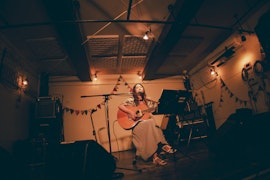 トリを飾るのは、下北沢を中心に活動するインディーズバンド、パターソンのボーカル&ギター、セリザワヒナタだ。リズミカルなアコースティックギターが響く「when I was young」からスタート。スウェディッシュ・ポップを思わせる洗練されたサウンドが場内に響く。「平日の夜にありがとうございます。お尻とか痛くなってくると思うので、楽に聞いてください」と、終始椅子に座りながらステージを楽しむ観客を気遣うセリザワヒナタ。続く「3番線」「トワイライト」と、繊細なサウンドにウィスパーがかった歌声を重ね、神秘的な空気を醸し出していく。「パターソンというバンドをやっております。パターソンで7月にリリースしたEPから何曲かやろうと思います」と言い、披露したのは「微熱」。アコースティックギター1本にも関わらず、幻想的で奥行きのあるサウンドを作り出していく。ひょうひょうとした佇まいでストイックにギターを鳴らすセリザワヒナタだが、その演奏には情感が宿っているように思える。無駄のない動きの中に確かな熱があり、音の一つひとつが彼女の心情を映し出していく。抑えた表現だからこそ際立つ感情の揺れ。「MY FRIEND!!」でもステージの余白に余韻を残した。「今日はありがとうございました。セリザワヒナタでした」とお礼を伝えるセリザワヒナタ。ラストソングは「セピア」。落ち着いたトーンの中に深みのあるサウンドと歌声が響く。丁寧に紡がれたギターの音色と安定感のあるボーカルが重なり合い、静かな熱を漂わせながらステージは幕を閉じた。