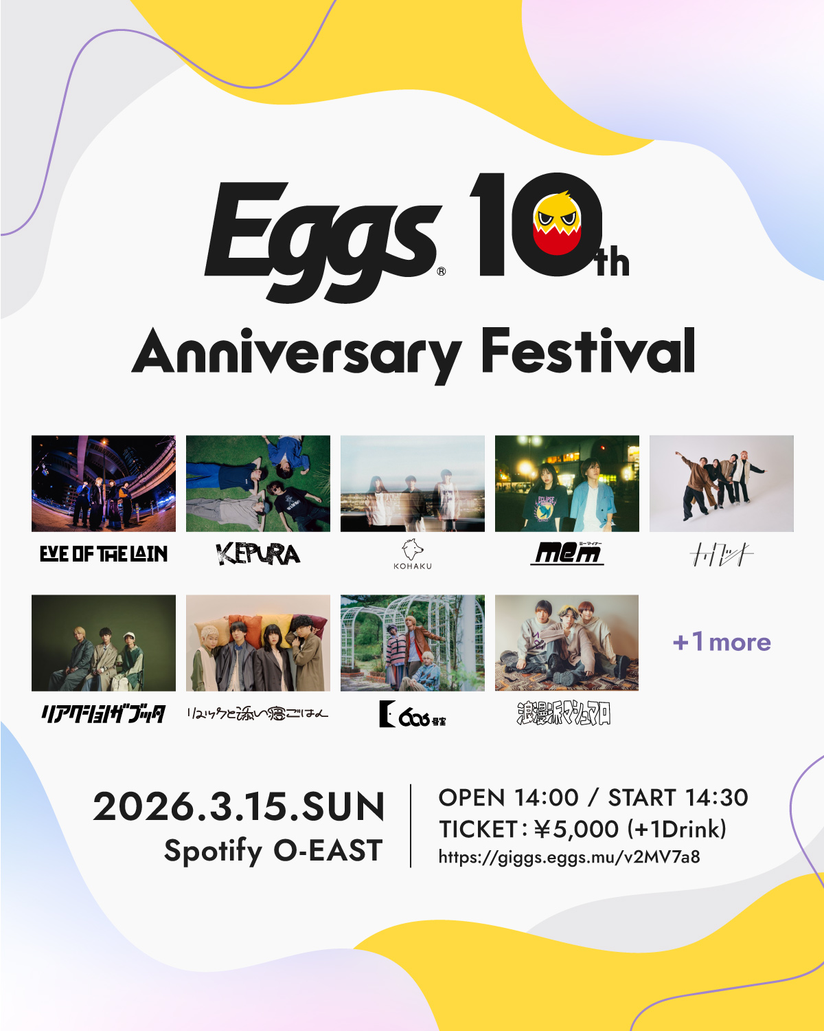 2026年3月15日(日)に東京・渋谷Spotify O-EASTにてEggsのサービス開始から10周年を記念したライブイベント「Eggs 10th Anniversary Festival」を開催します!