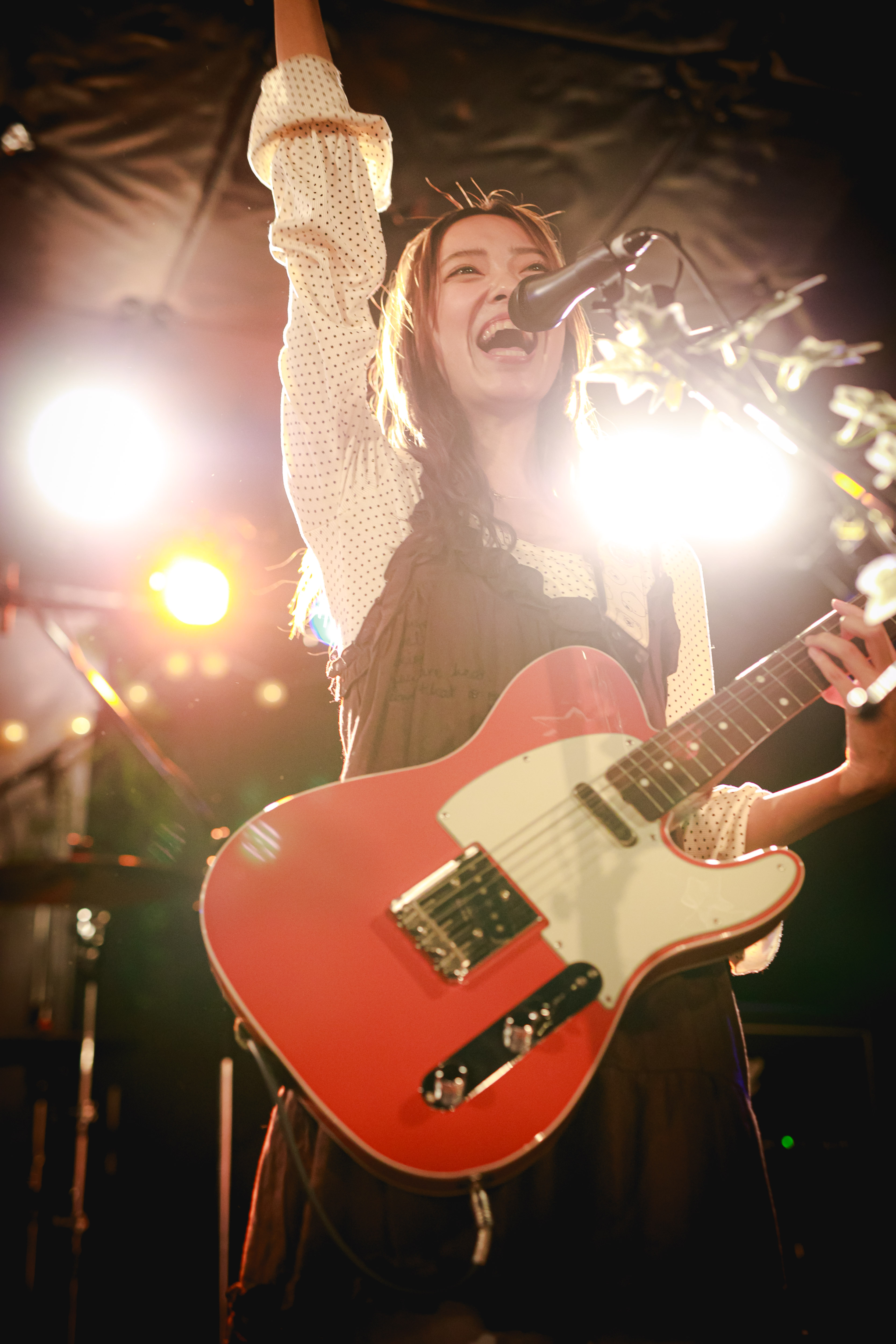 トップバッターは、地元・仙台から登場の3ピース・バンド、ティプシーズ。そう、この日のガールズ・バンドは、すべて3ピース。そういった統一感があるからこそ、各々の個性が見えて面白い。ティプシーズの長谷川(Vo/Gt)も「この縛りはあんまりない」と語っていたように、バンドにとっても新鮮だったようだ。そんなティプシーズは「ビールズ・バンド」と呼ばれるほどのビール好き。乾杯ソング“ジャイブ!”では、曲中の<乾杯>コールを練習し、実際に缶ビールを「おいし~い」と飲んじゃう姿も。そのノリのよさで、しょっぱなからフロアの一体感を生み出した。飲み友でもあるからか!? 3人の息の合った演奏も印象的で、見つめ合ったり、ブレイクをキメたり。横ノリがかわいらしい“黄昏ロマンス”など、誰よりも彼女たち自身が楽しそうで、そのテンションはオーディエンスにも伝播していった。