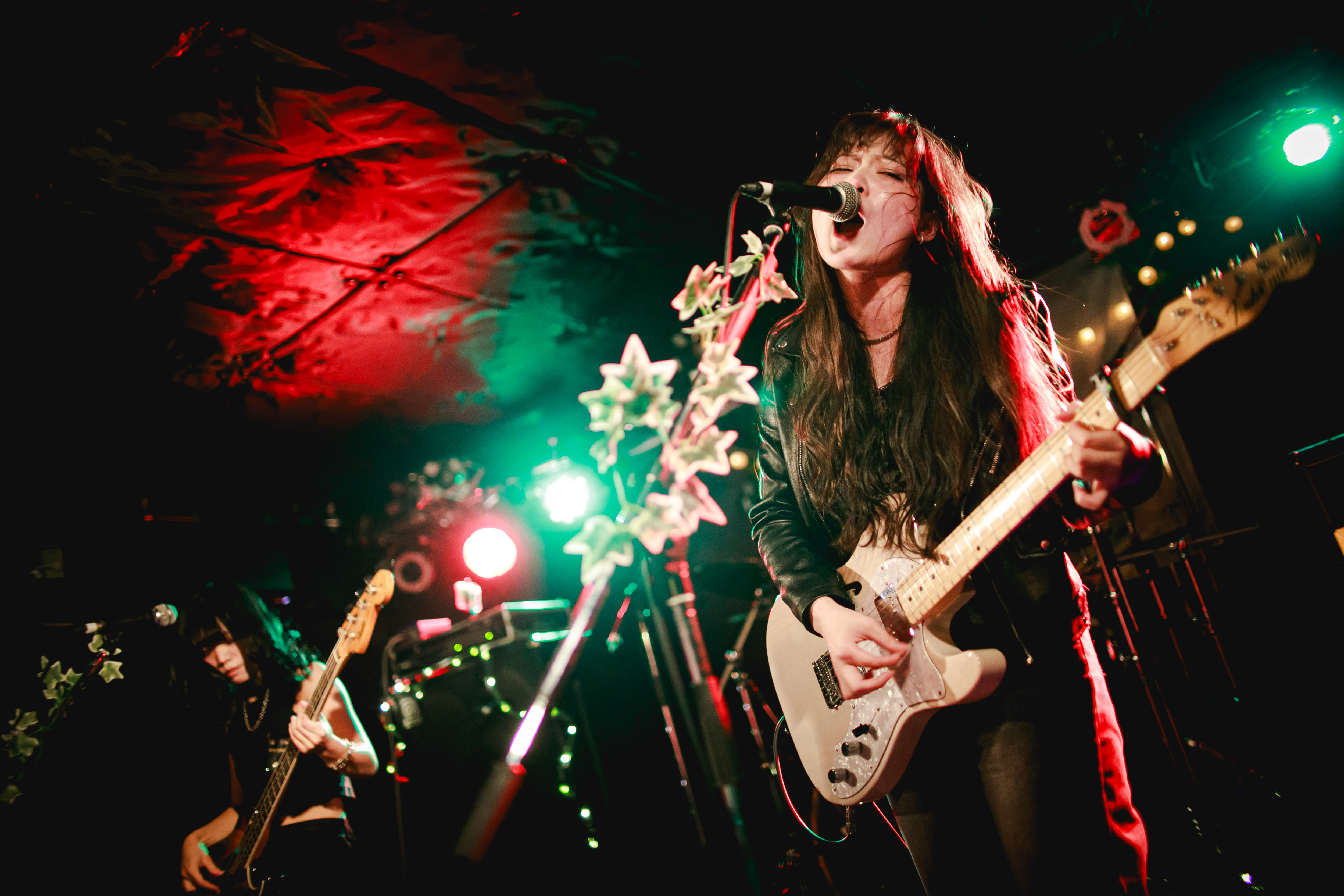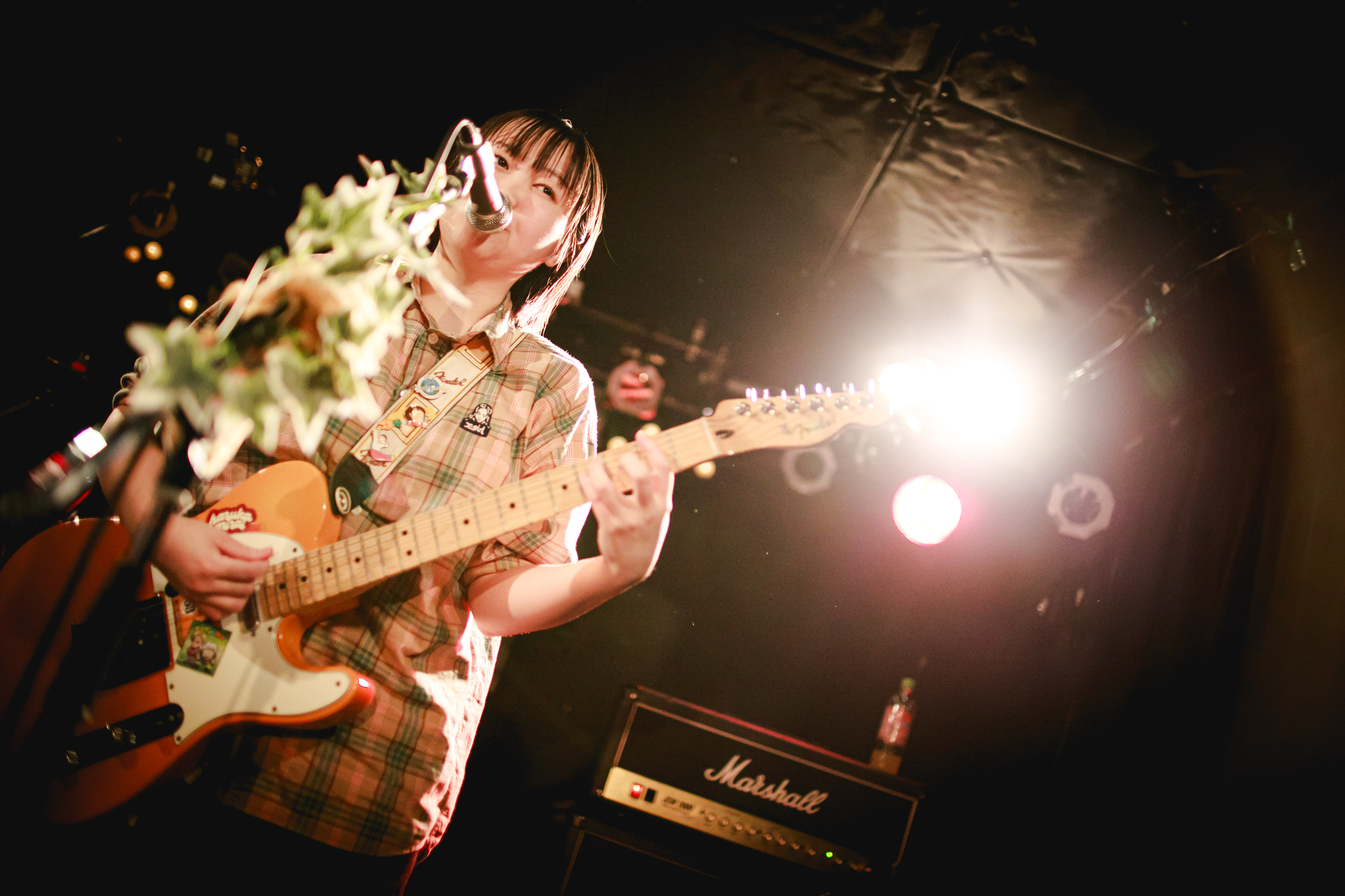 温かな空気に満たされたフロアにピリッと刺激をもたらしたのは、大阪からやってきた台所きっちん。かわいらしさやユーモアが滲むバンド名とは裏腹に、ヴィジュアルも硬派で、歪みは激しく音量もデカい。ライダース姿の花菜(Vo/Gt)がロングヘアを振り乱しながら、大阪っぽいブルージーな憂いや色気を漂わせて歌う姿は、東北に初上陸したバンドとは思えない貫禄があった。しかし、仙台に降り立ったときに「めっちゃ寒くってびっくりした」とはにかむMCは初々しく、そのギャップも魅力。終わった恋を歌う豪快なラストナンバー“バカ”を聴きながら、近い将来にもっと大きな会場のフロアを埋め尽くした女の子たちが、清々しい表情で<バカ>コールをしている姿をイメージせずにはいられなかった。
