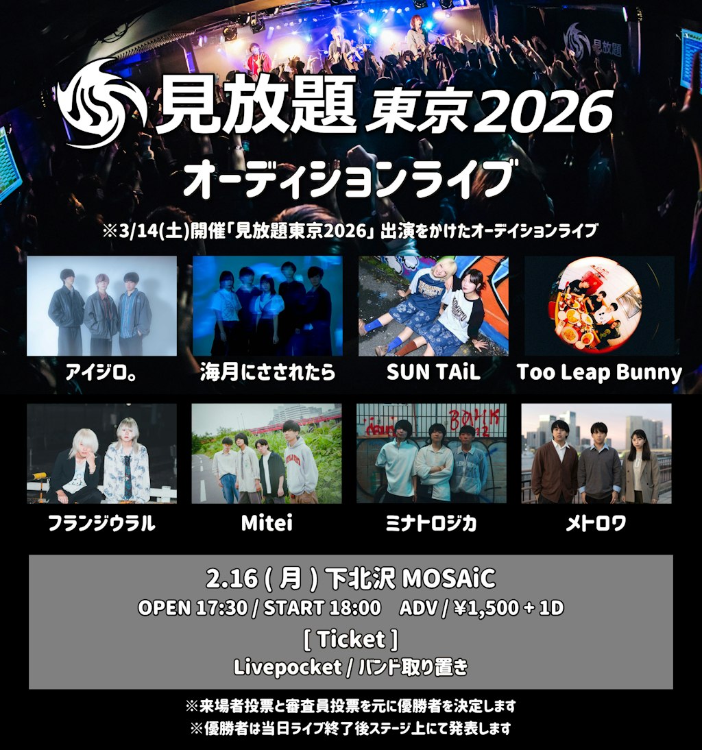 2026年3月14日(土)に新宿で開催される見放題東京2026への出演を賭けたオーディションライブは2月16日(月)下北沢MOSAiCにて開催されるが、そこへの出演アーティスト8組が発表になった。