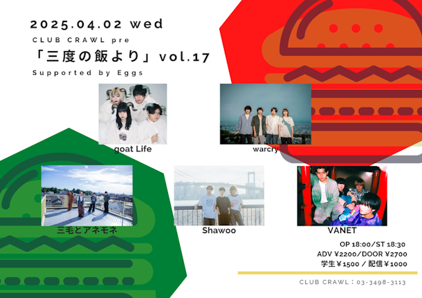 4/2(水)渋谷CLUB CRAWLpre.ニューカマーイベント「三度の飯より vol.17」開催決定!