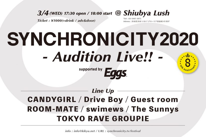 4月4日(土)、5日(日)に開催される「SYNCHRONICITY 2020 – 15th Anniversary!! –」への出演をかけたオーディションのライブ審査が、3月4日(水)渋谷LUSHにて開催される。